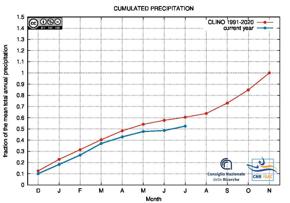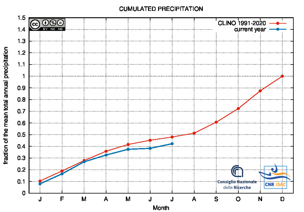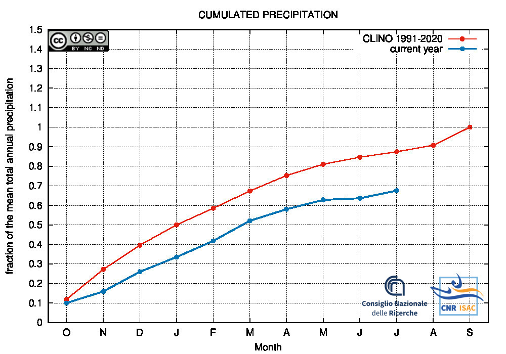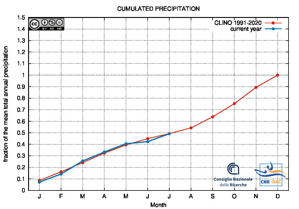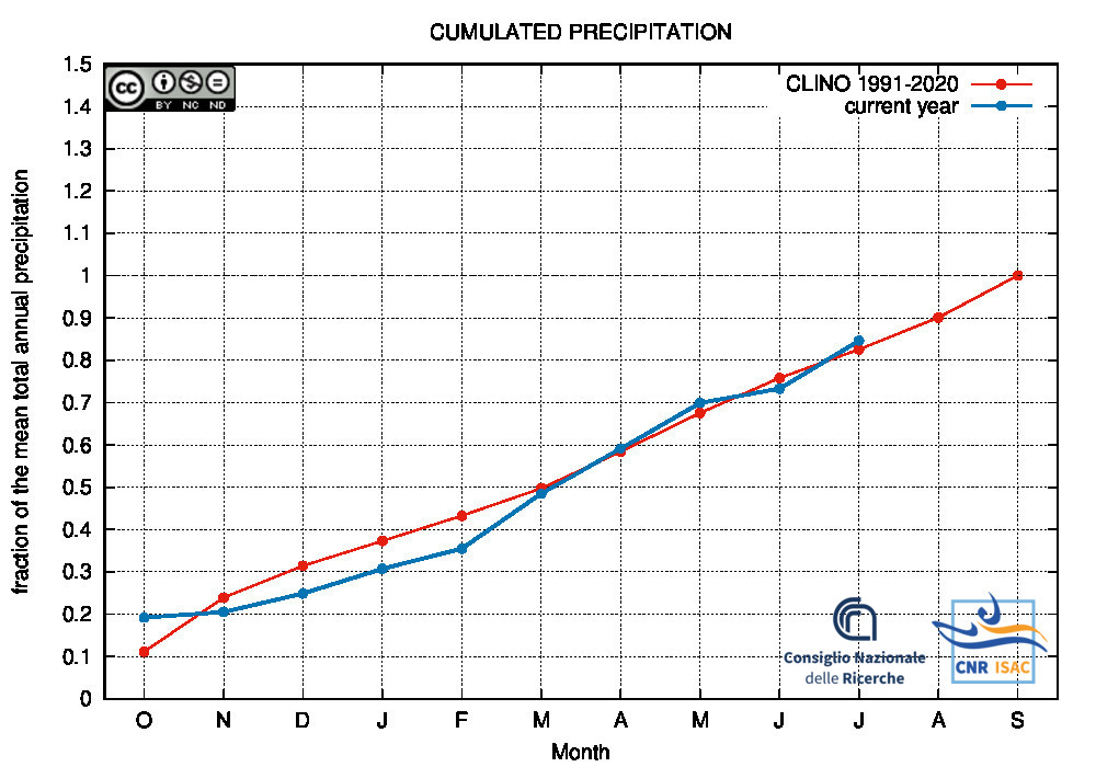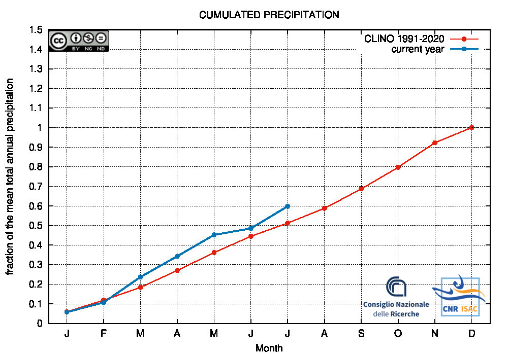 Comparison of the cumulated precipitation along the current year with the climatological cumulated values (reference period 1991-2020)
