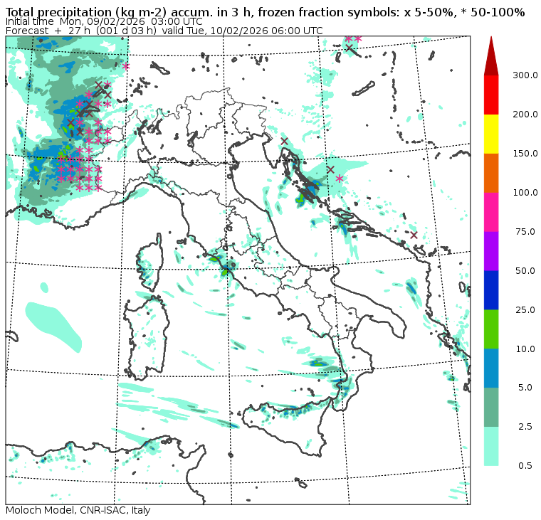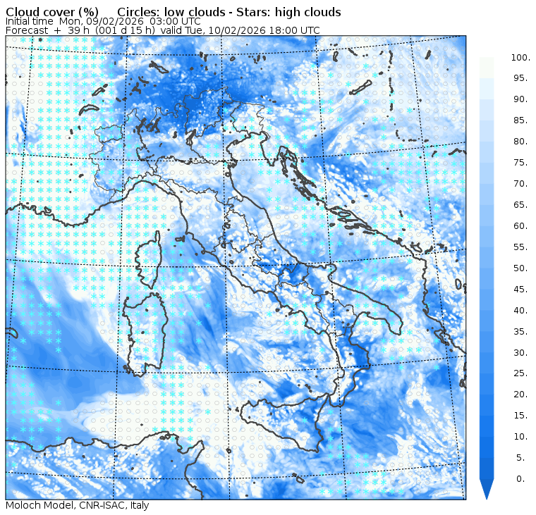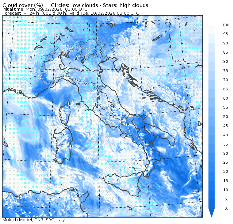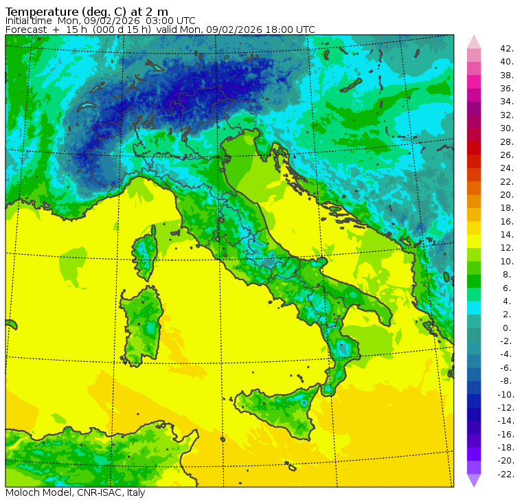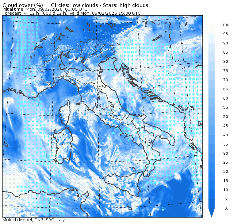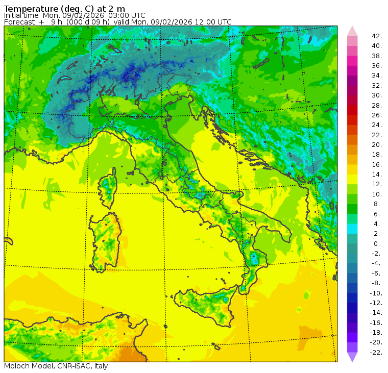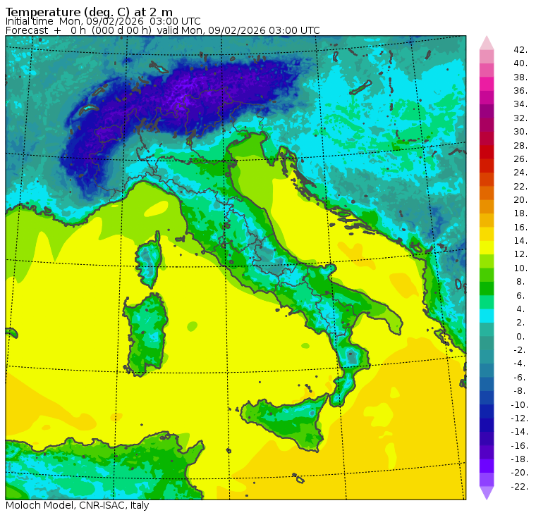 I dati osservati sono acquisiti mediante una stazione meteorologica IRDAM WST 7000, installata a 2 m di altezza sul prato ad Ovest della palazzina ISAC. Le previsioni numeriche con validità 2 giorni sono derivate dal modello MOLOCH, sviluppato da CNR-ISAC, Istituto di Scienze dell'Atmosfera e del Clima del Consiglio Nazionale delle Ricerche, e utilizzato alla risoluzione orizzontale di 1.25 km. Le condizioni iniziali e al contorno per la previsione sono ottenute da analisi (00:00 UTC) e previsioni del modello GFS, NCEP-NOOA (Global Forecast System del National Centers for Environmental Prediction - National Oceanic and Atmospheric Administration, USA). Maggiori dettagli su www.isac.cnr.it/dinamica/projects/forecasts/index.html. Per una valutazione dell'anomalia climatica dell'ultimo mese/stagione/anno nel contesto degli ultimi due secoli di variabilità climatica si veda il link http://www.isac.cnr.it/climstor/climate_news.html. Le informazioni ed i grafici presenti in questo sito sono generati utilizzando dati grezzi e non validati. Pertanto queste informazioni sono fornite così come sono e non sono garantite nella loro correttezza e/o completezza. Le conclusioni derivate dai contenuti del sito sono di responsabilità degli utenti che le hanno formulate. Il CNR declina ogni responsabilità da un uso improprio delle informazioni fornite in questo sito. Per informazioni: infometeobologna @ isac.cnr.it versione beta sviluppata da Mauro Mazzola, Maurizio Busetto, Ubaldo Bonafè, Fabrizio Roccato, Paolo Bonasoni |