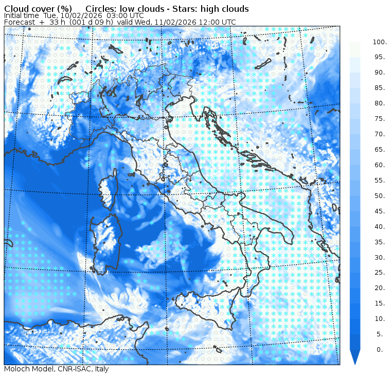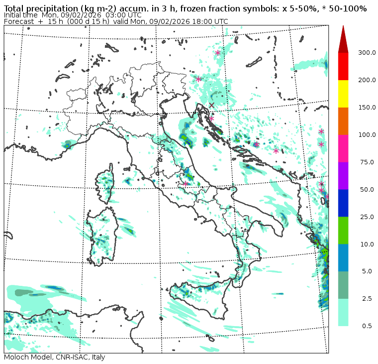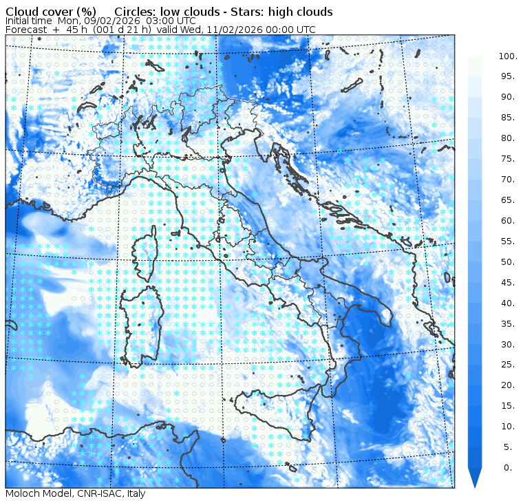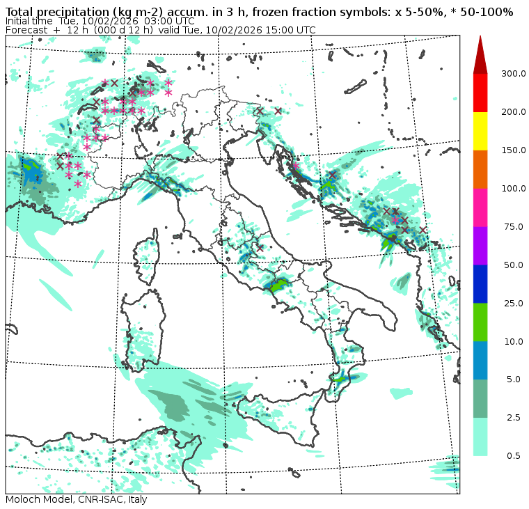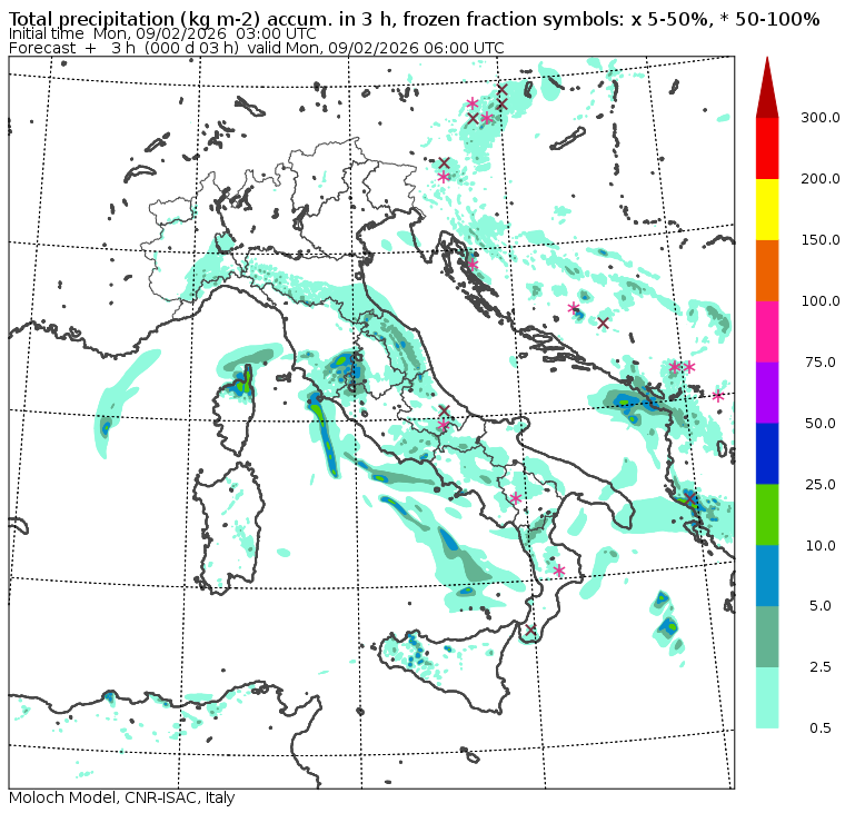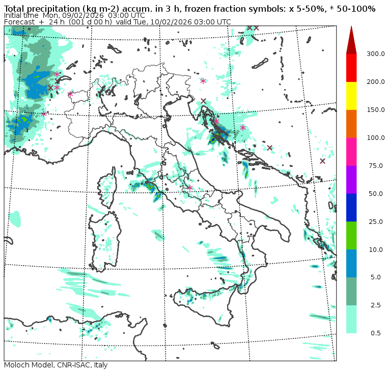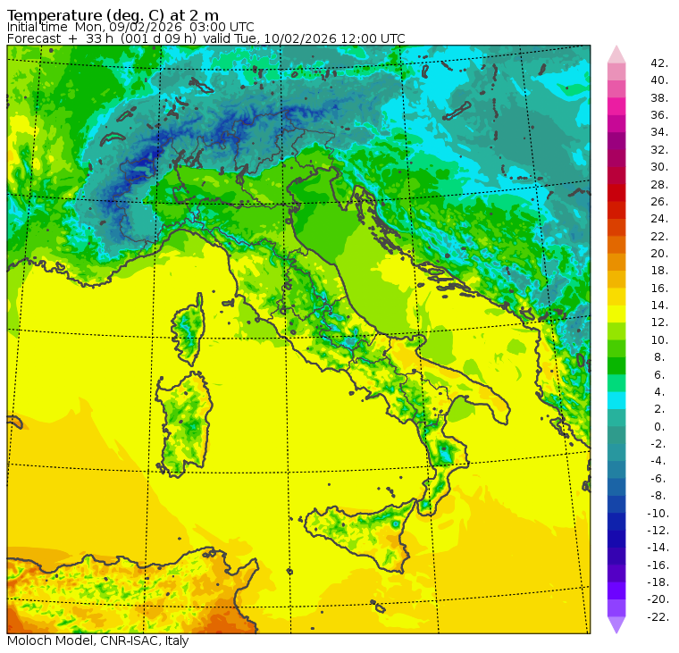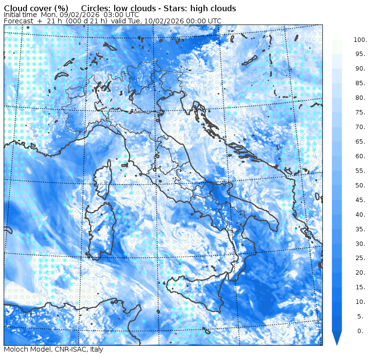 I dati osservati sono acquisiti mediante una stazione meteorologica IRDAM WST 7000, installata a 2 m di altezza sul prato ad Ovest della palazzina ISAC. Le previsioni numeriche con validità 2 giorni sono derivate dal modello MOLOCH, sviluppato da CNR-ISAC, Istituto di Scienze dell'Atmosfera e del Clima del Consiglio Nazionale delle Ricerche, e utilizzato alla risoluzione orizzontale di 1.25 km. Le condizioni iniziali e al contorno per la previsione sono ottenute da analisi (00:00 UTC) e previsioni del modello GFS, NCEP-NOOA (Global Forecast System del National Centers for Environmental Prediction - National Oceanic and Atmospheric Administration, USA). Maggiori dettagli su www.isac.cnr.it/dinamica/projects/forecasts/index.html. Per una valutazione dell'anomalia climatica dell'ultimo mese/stagione/anno nel contesto degli ultimi due secoli di variabilità climatica si veda il link http://www.isac.cnr.it/climstor/climate_news.html. Le informazioni ed i grafici presenti in questo sito sono generati utilizzando dati grezzi e non validati. Pertanto queste informazioni sono fornite così come sono e non sono garantite nella loro correttezza e/o completezza. Le conclusioni derivate dai contenuti del sito sono di responsabilità degli utenti che le hanno formulate. Il CNR declina ogni responsabilità da un uso improprio delle informazioni fornite in questo sito. Per informazioni: infometeobologna @ isac.cnr.it versione beta sviluppata da Mauro Mazzola, Maurizio Busetto, Ubaldo Bonafè, Fabrizio Roccato, Paolo Bonasoni |