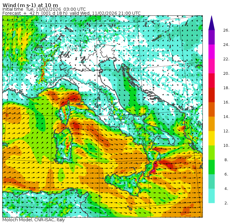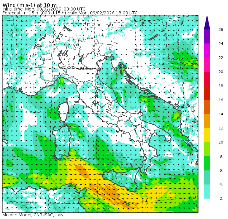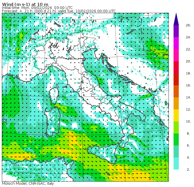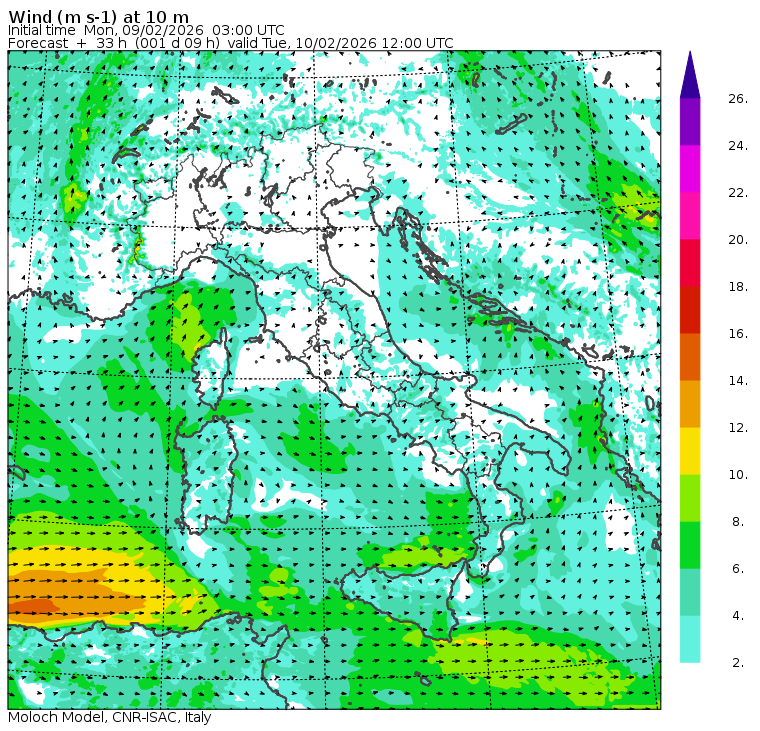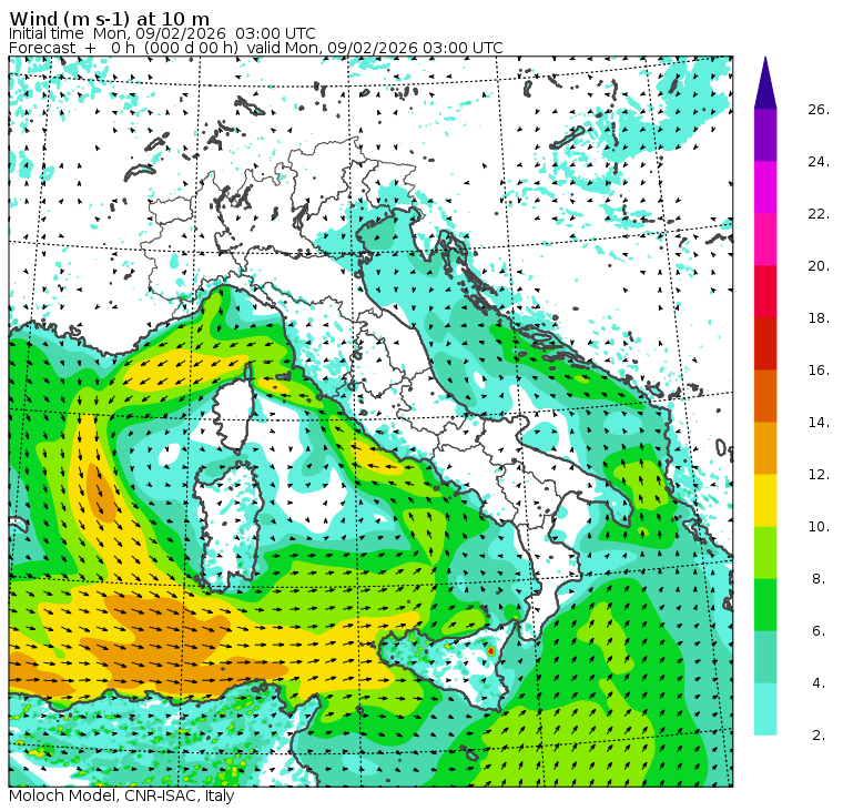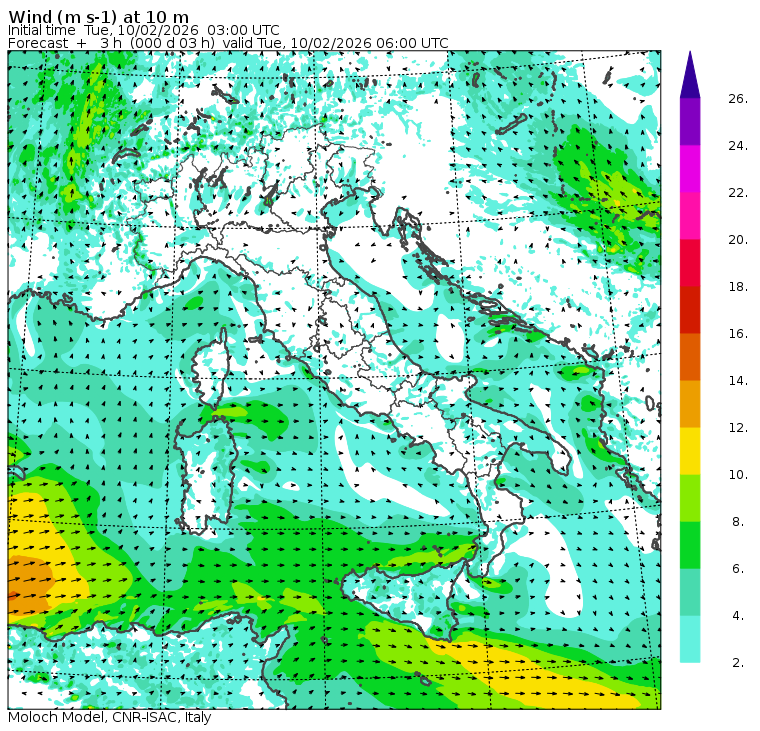 Mappe di previsione regionali (orarie) e nazionali (tri-orarie) di temperatura, precipitazione (totale e nevosa), nuvolosità e vento. Per le mappe regionali viene riportata anche la temperatura del mare in alcune località costiere. Dati meteorologici osservati nella giornata di oggi presso l'Area di Ricerca di Bologna.