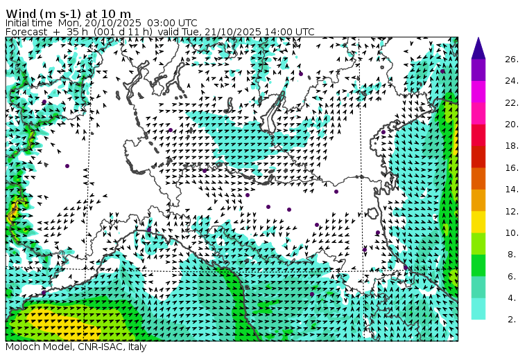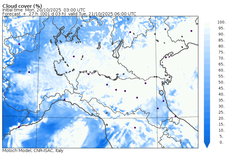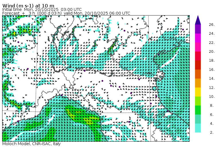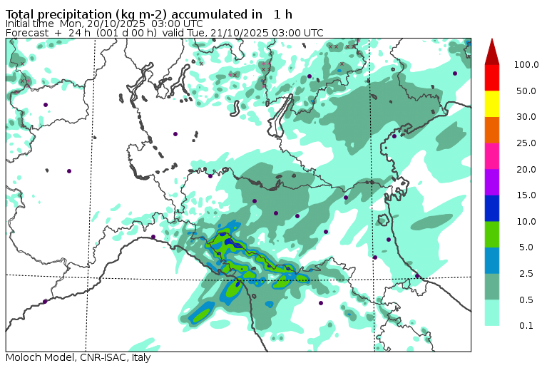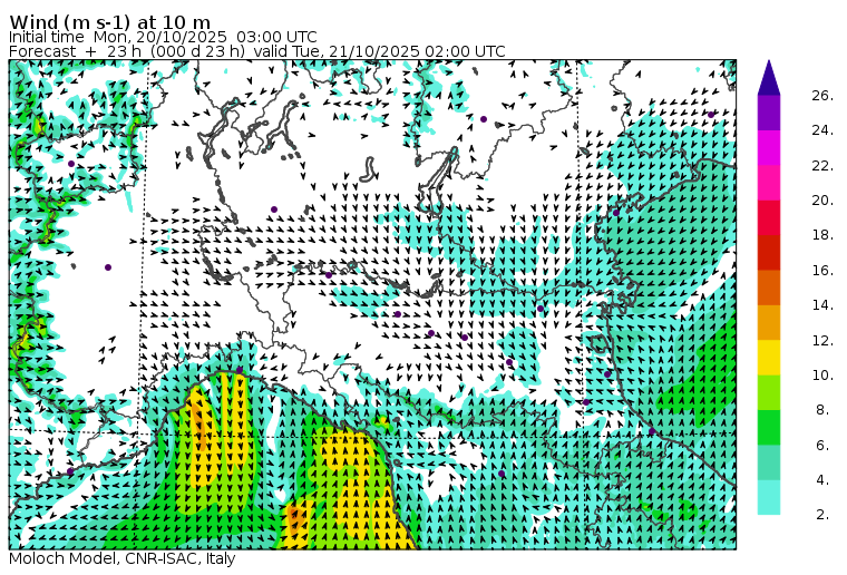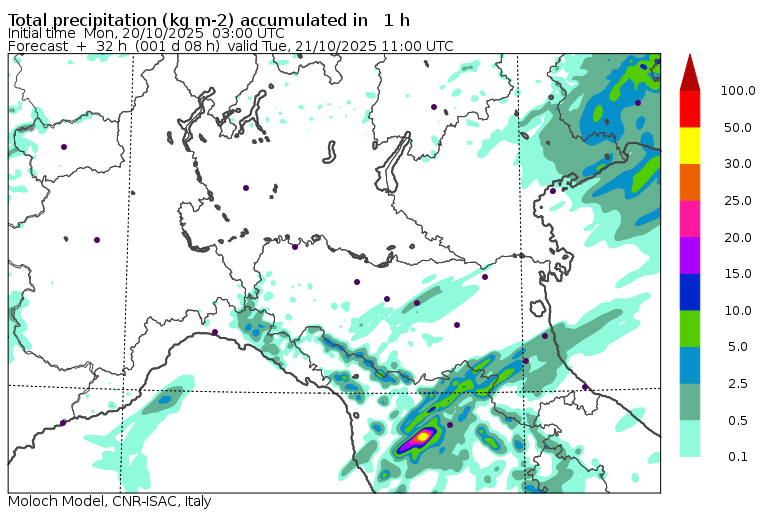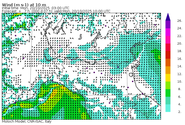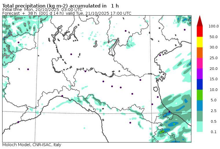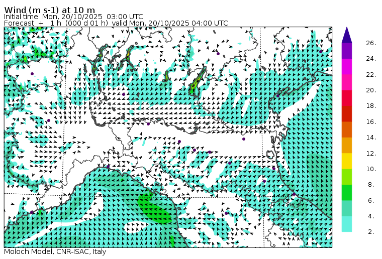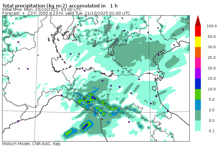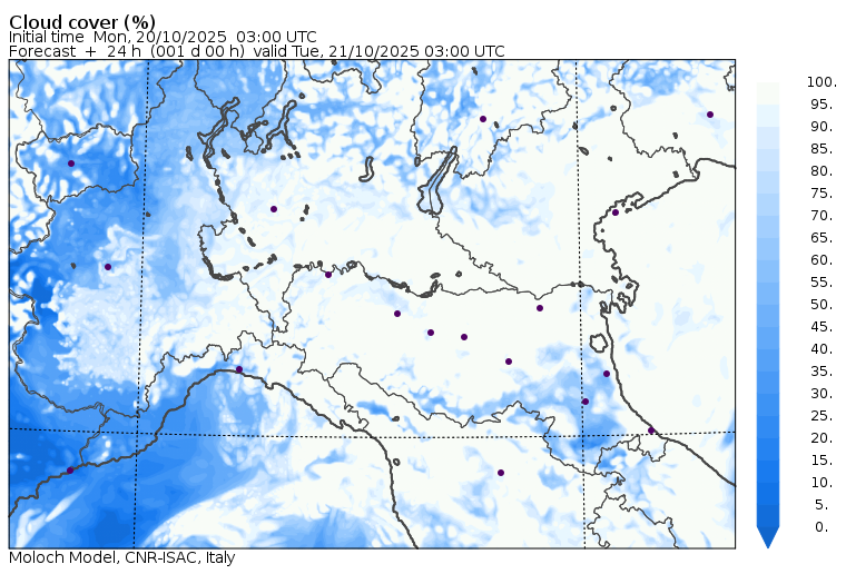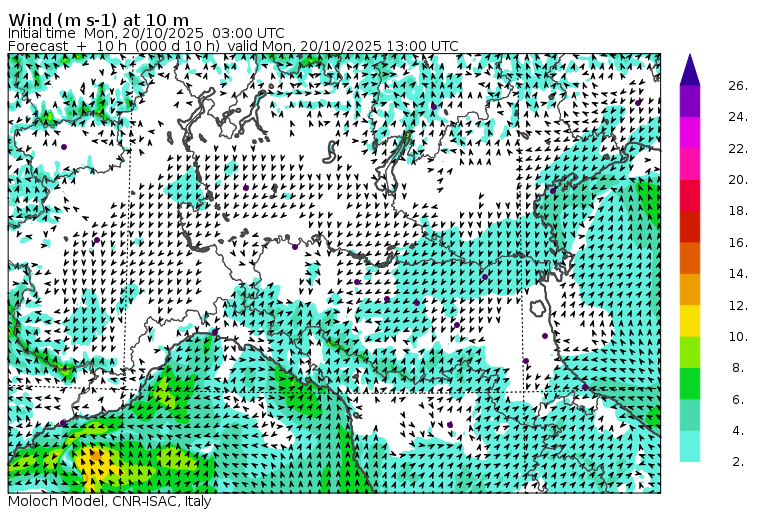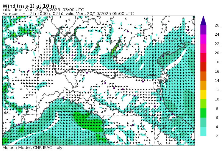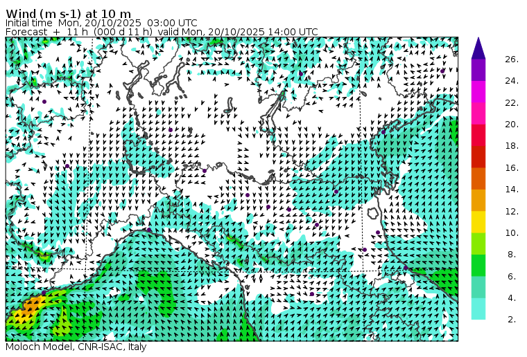 The numerical predictions with validity of two days are derived from MOLOCH model, developed by CNR-ISAC and used at the horizontal resolution of 1.25 km. The initial and boundary conditions for the predictions are obtained from analysis (00:00 UTC) and forecasts by the GFS model of NOAA-NCEP (Global Forecast System del National Centers for Environmental Prediction - National Oceanic and Atmospheric Administration, USA). More details are available at http://www.isac.cnr.it/dinamica/projects/forecasts/index.html.