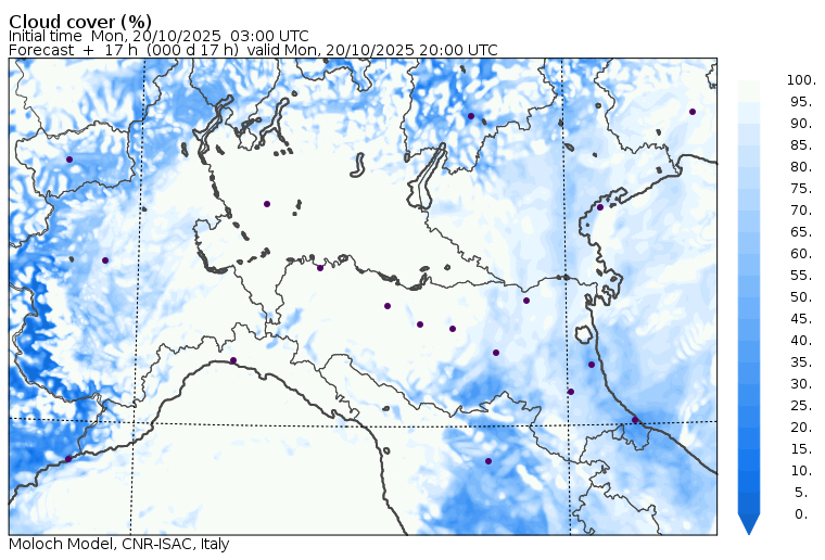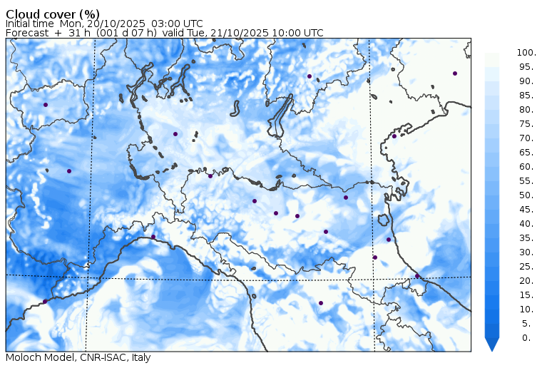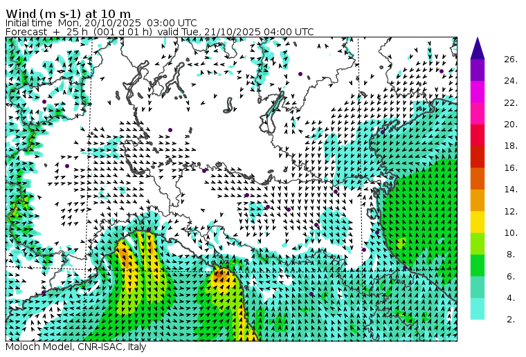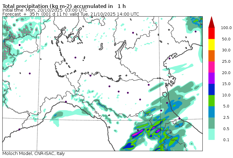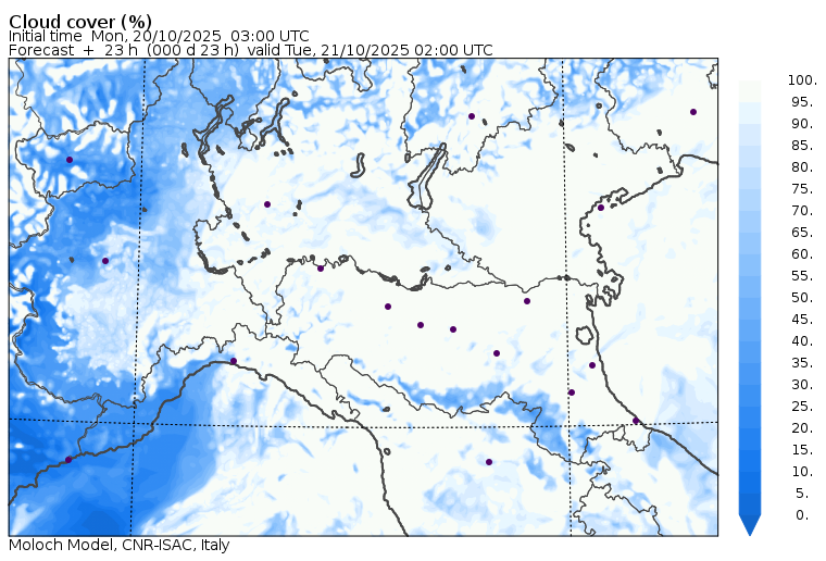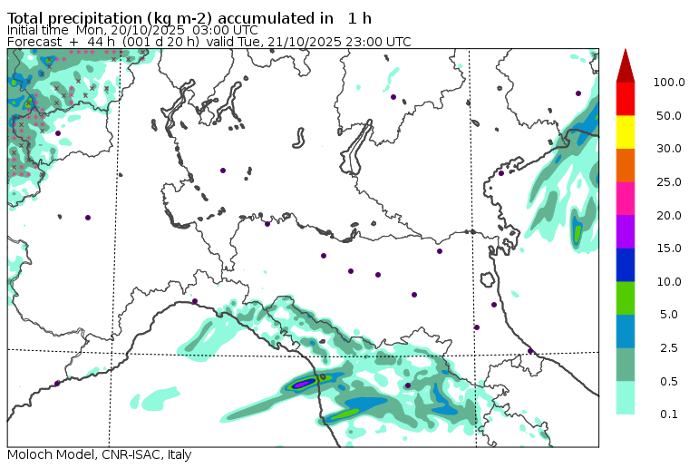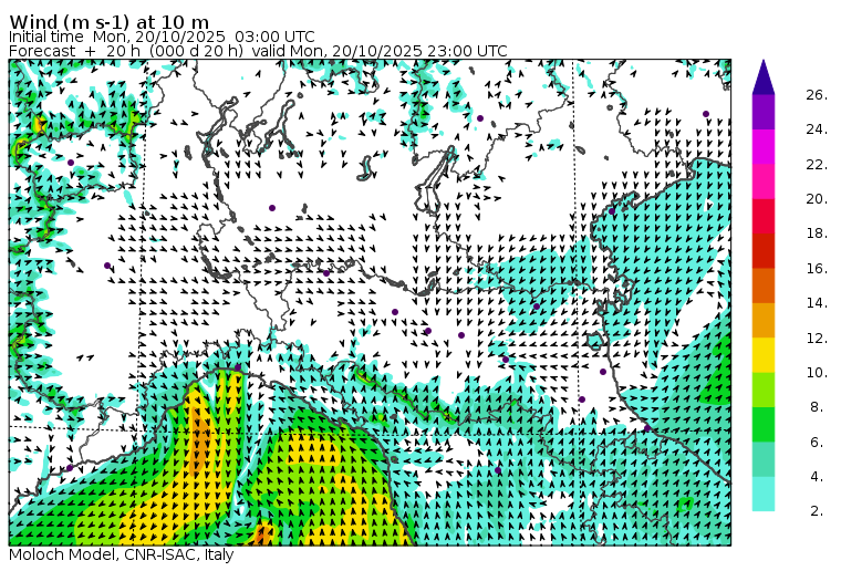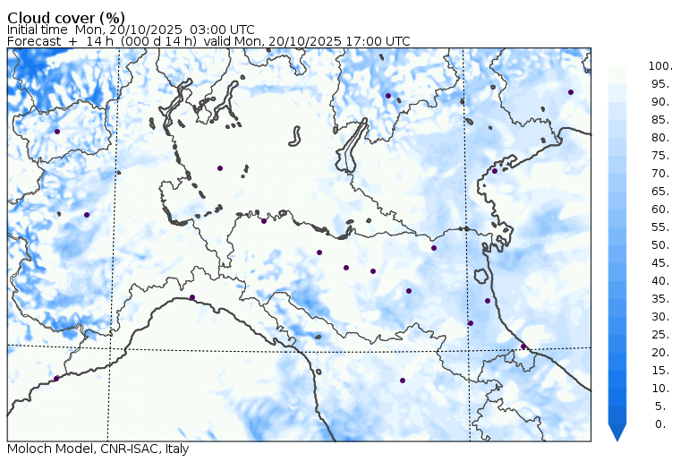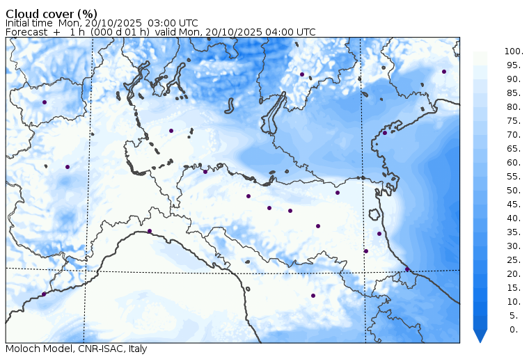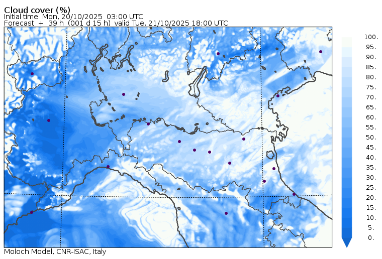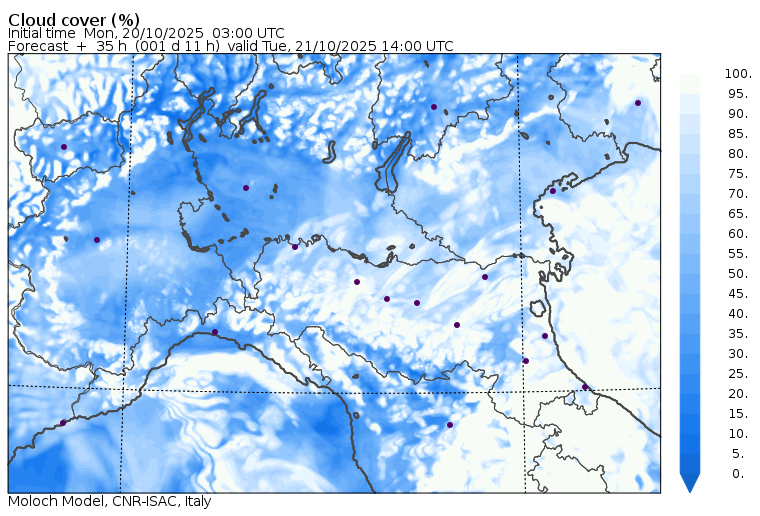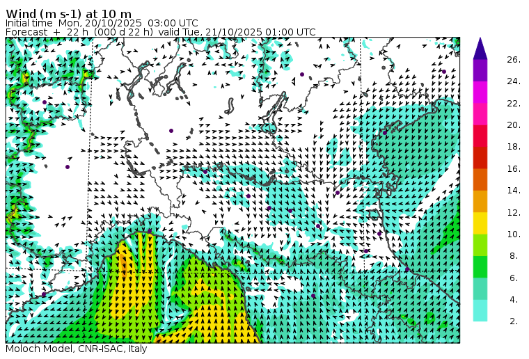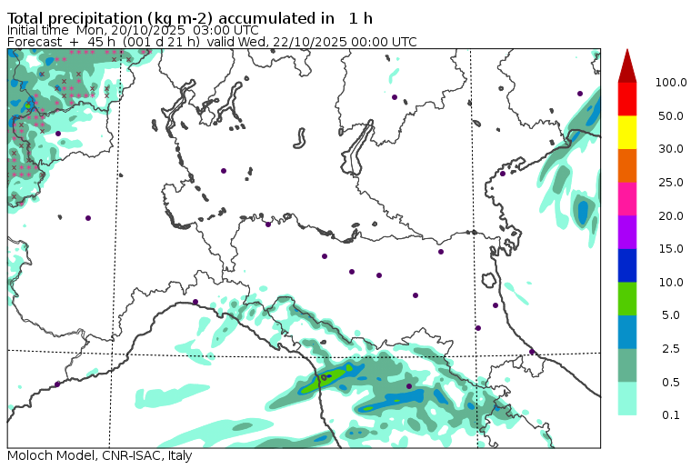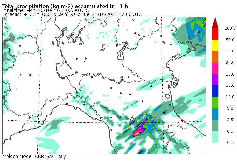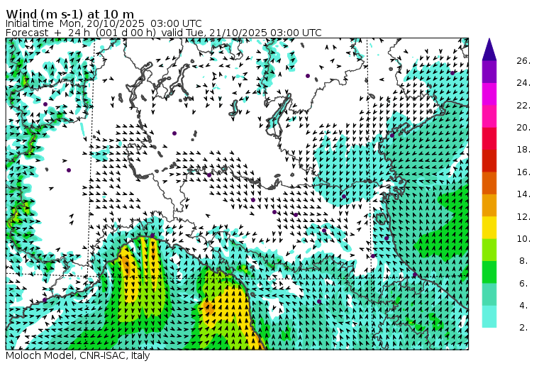The numerical predictions with validity of two days are derived from MOLOCH model, developed by CNR-ISAC and used at the horizontal resolution of 1.25 km. The initial and boundary conditions for the predictions are obtained from analysis (00:00 UTC) and forecasts by the GFS model of NOAA-NCEP (Global Forecast System del National Centers for Environmental Prediction - National Oceanic and Atmospheric Administration, USA). More details are available at http://www.isac.cnr.it/dinamica/projects/forecasts/index.html.
