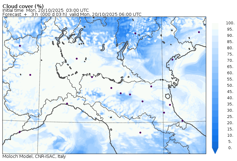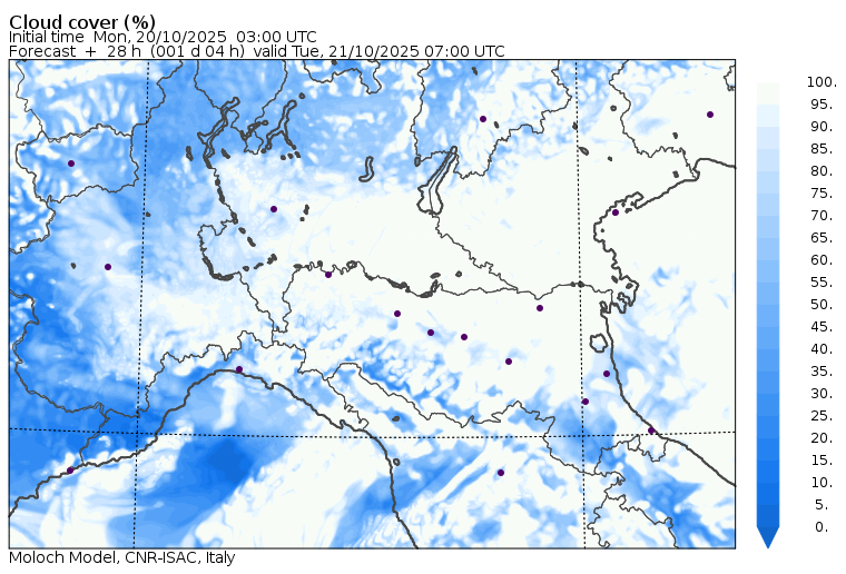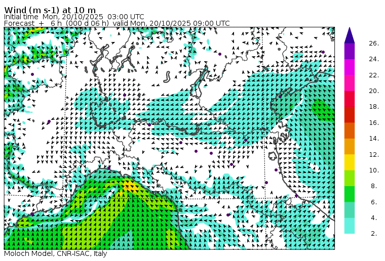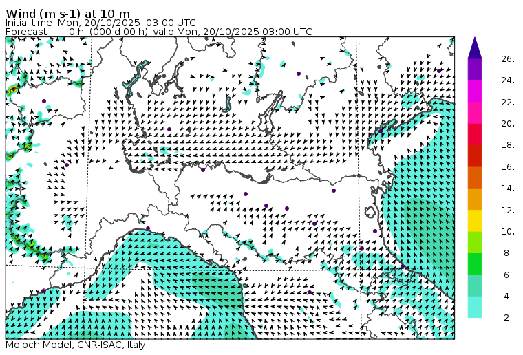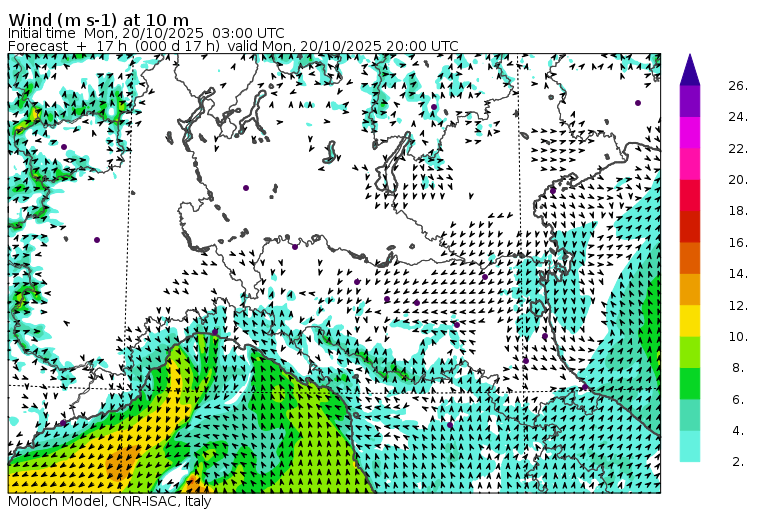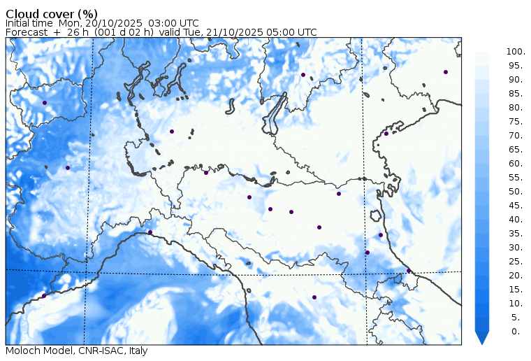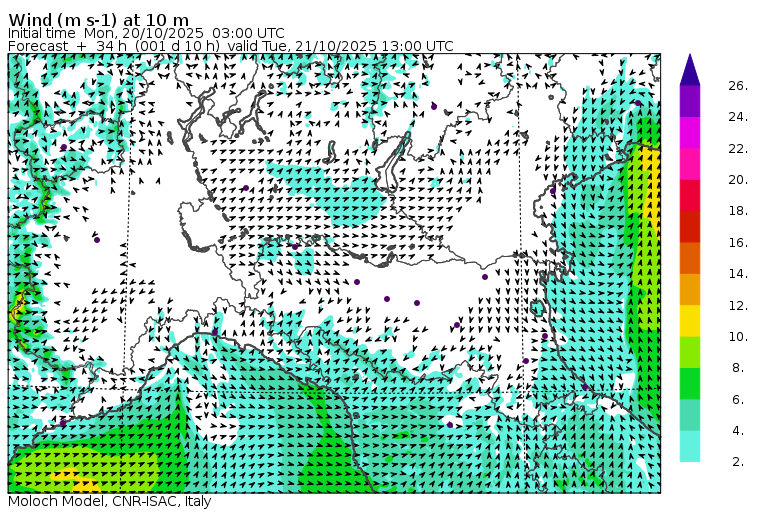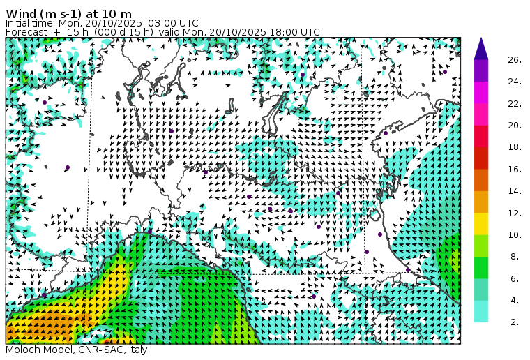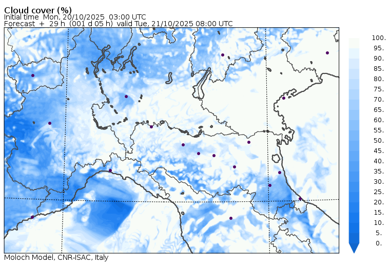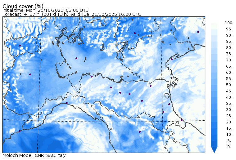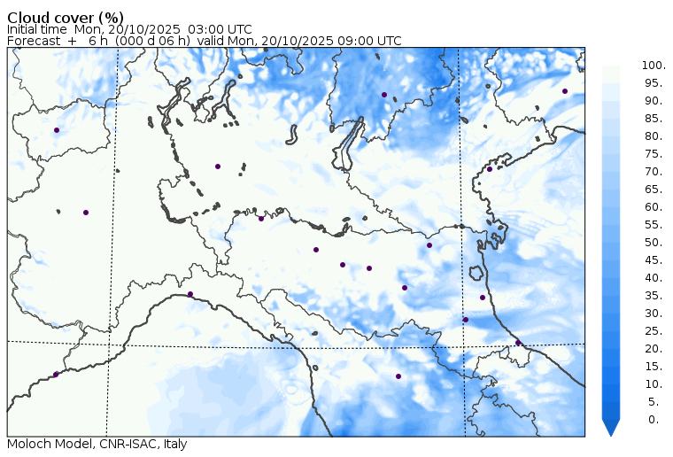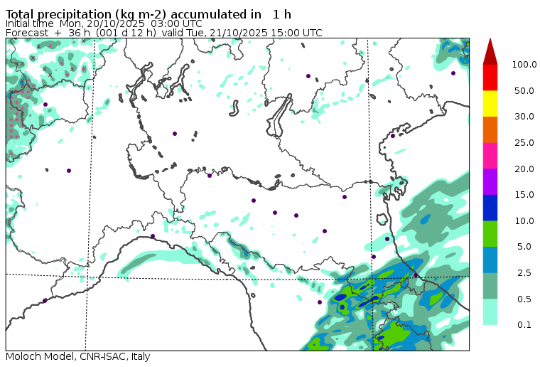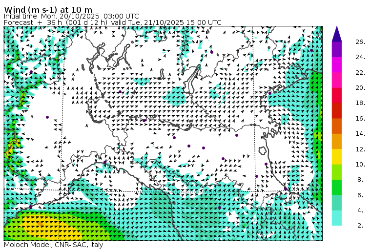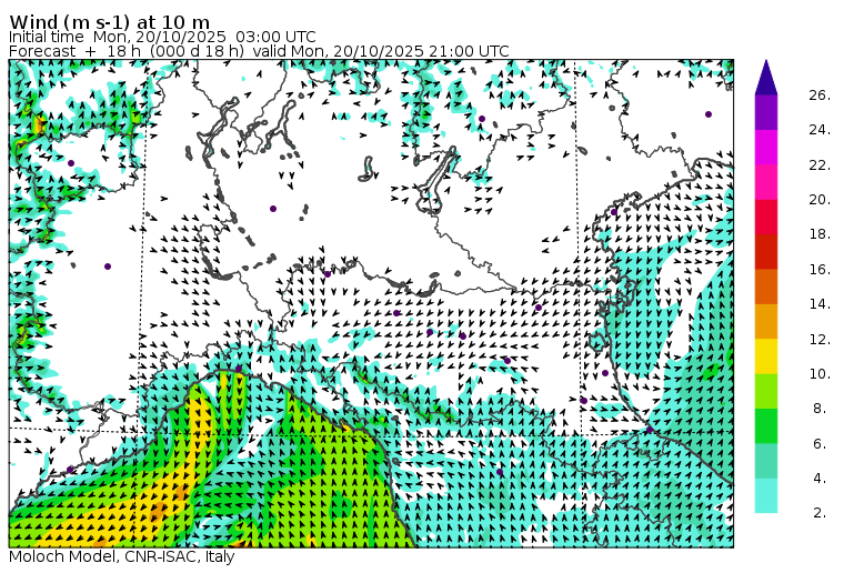 The numerical predictions with validity of two days are derived from MOLOCH model, developed by CNR-ISAC and used at the horizontal resolution of 1.25 km. The initial and boundary conditions for the predictions are obtained from analysis (00:00 UTC) and forecasts by the GFS model of NOAA-NCEP (Global Forecast System del National Centers for Environmental Prediction - National Oceanic and Atmospheric Administration, USA). More details are available at http://www.isac.cnr.it/dinamica/projects/forecasts/index.html.