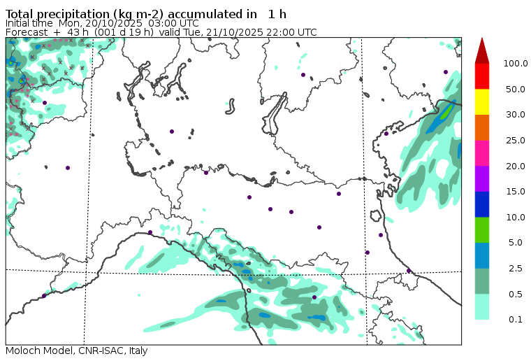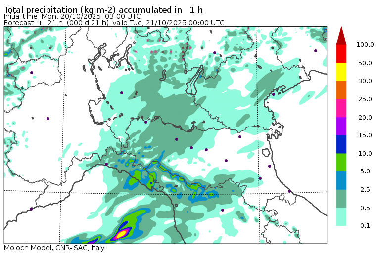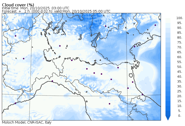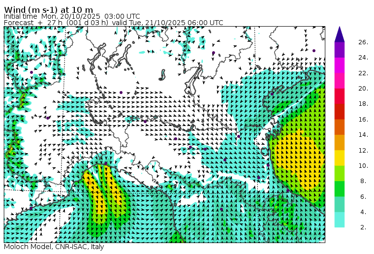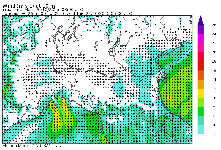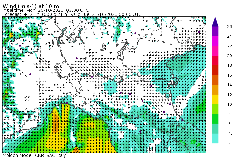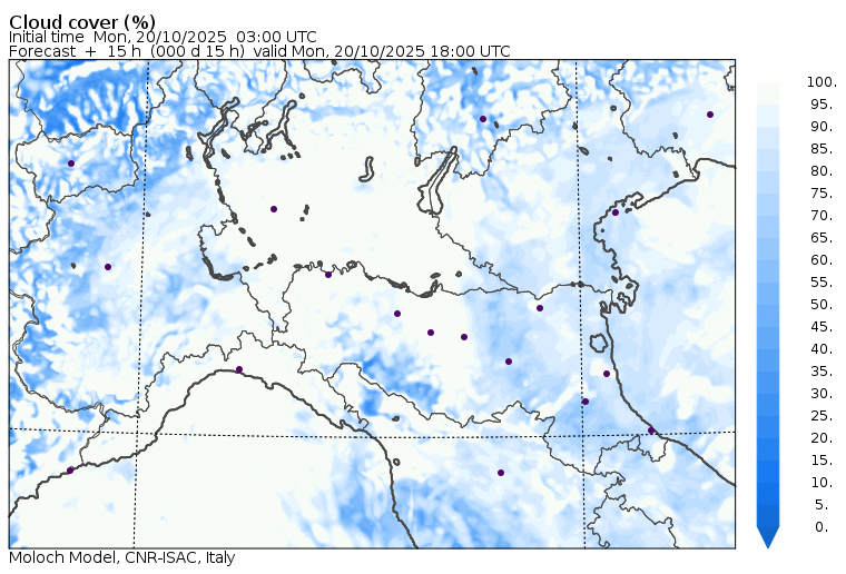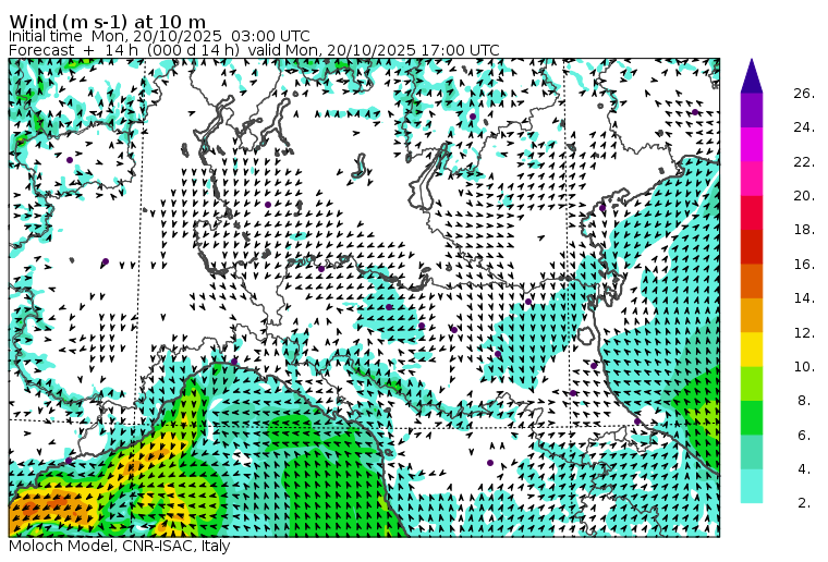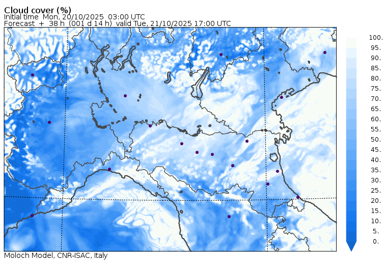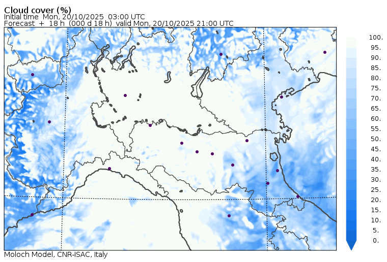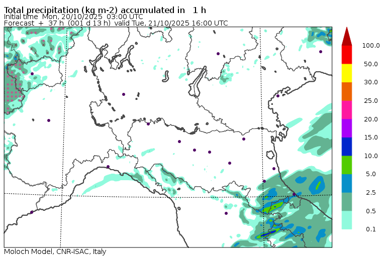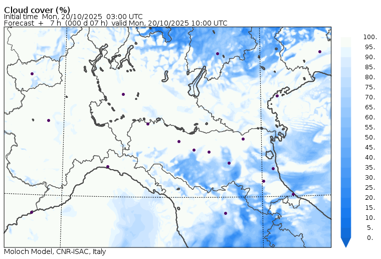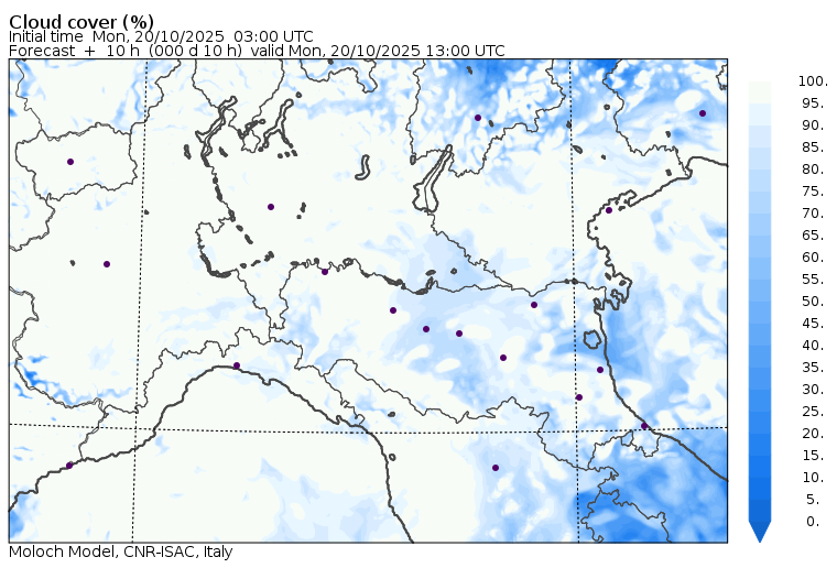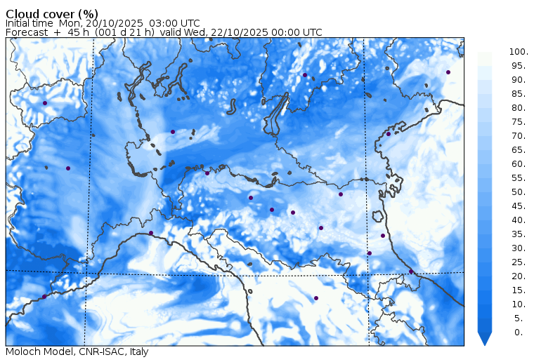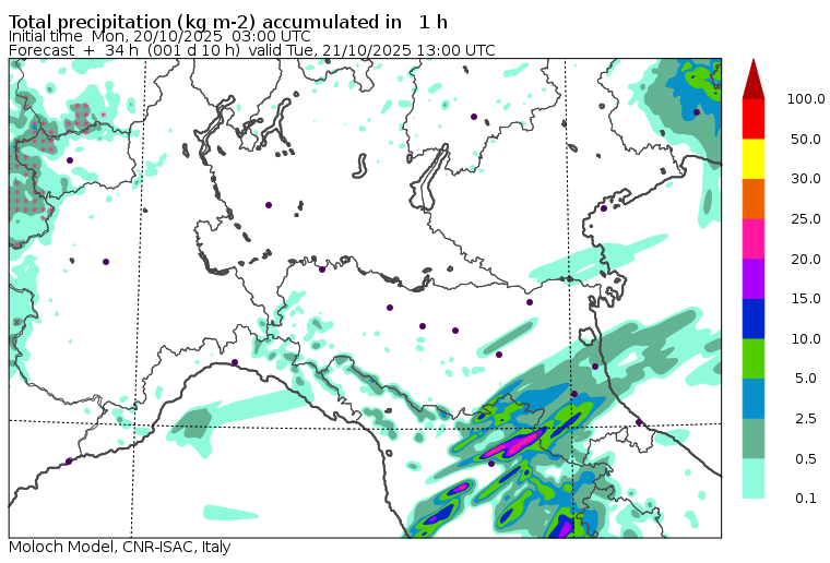 The numerical predictions with validity of two days are derived from MOLOCH model, developed by CNR-ISAC and used at the horizontal resolution of 1.25 km. The initial and boundary conditions for the predictions are obtained from analysis (00:00 UTC) and forecasts by the GFS model of NOAA-NCEP (Global Forecast System del National Centers for Environmental Prediction - National Oceanic and Atmospheric Administration, USA). More details are available at http://www.isac.cnr.it/dinamica/projects/forecasts/index.html.