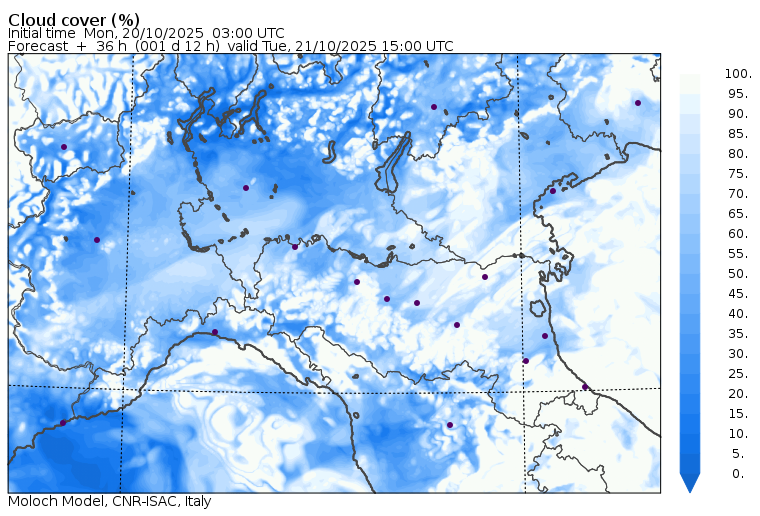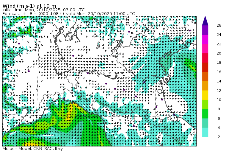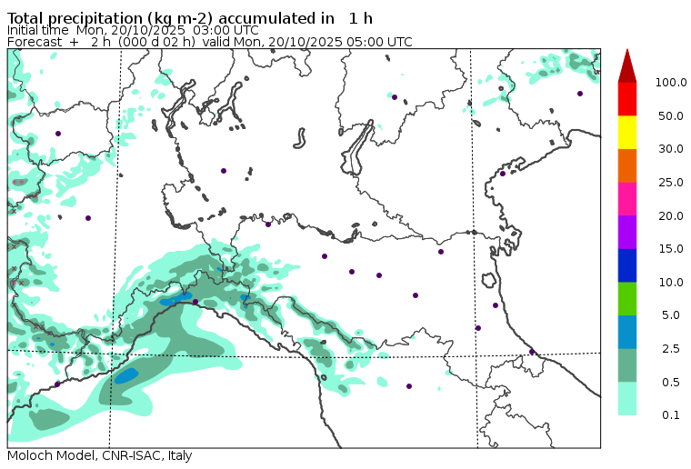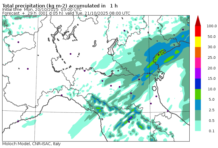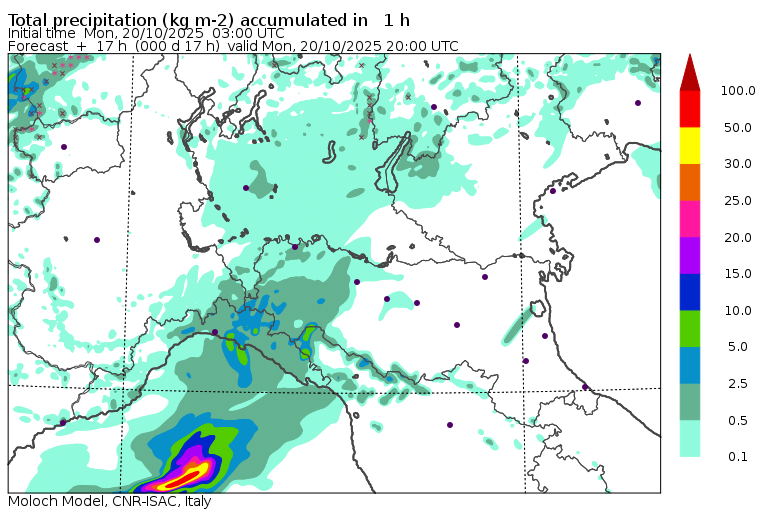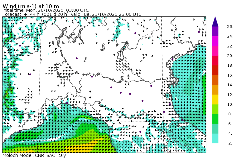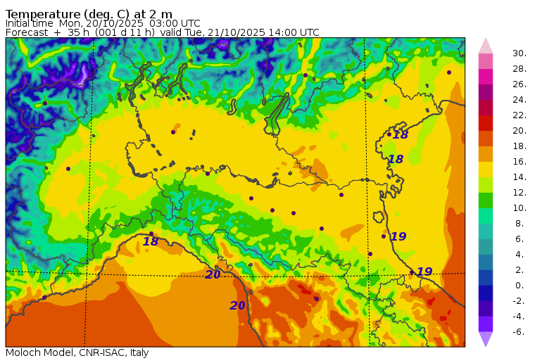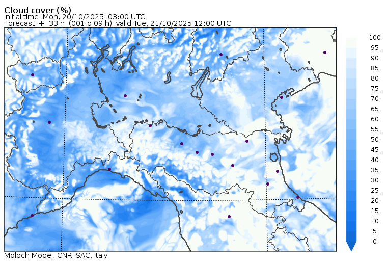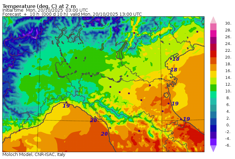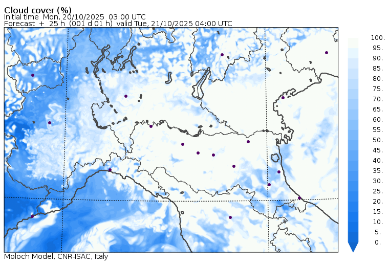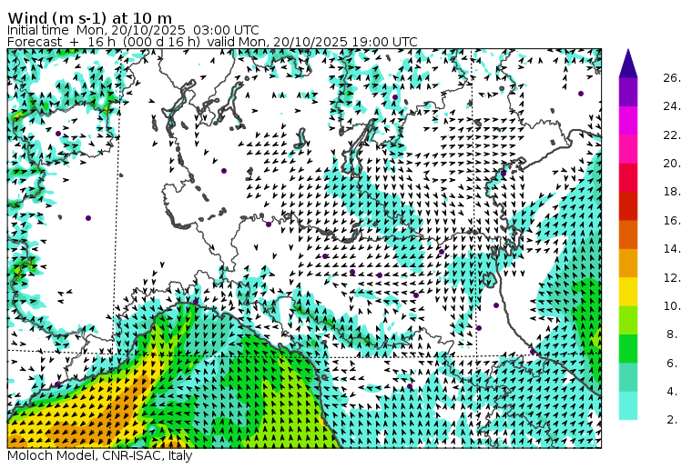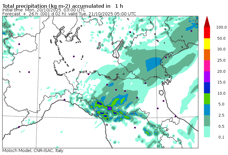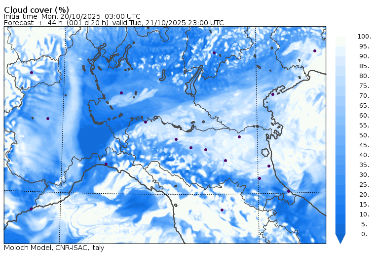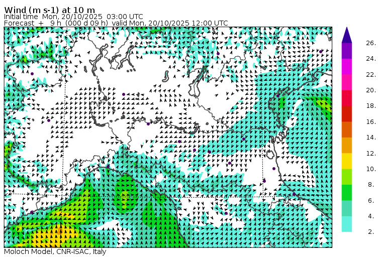 The numerical predictions with validity of two days are derived from MOLOCH model, developed by CNR-ISAC and used at the horizontal resolution of 1.25 km. The initial and boundary conditions for the predictions are obtained from analysis (00:00 UTC) and forecasts by the GFS model of NOAA-NCEP (Global Forecast System del National Centers for Environmental Prediction - National Oceanic and Atmospheric Administration, USA). More details are available at http://www.isac.cnr.it/dinamica/projects/forecasts/index.html.