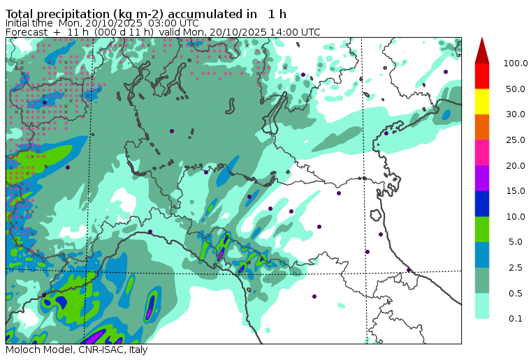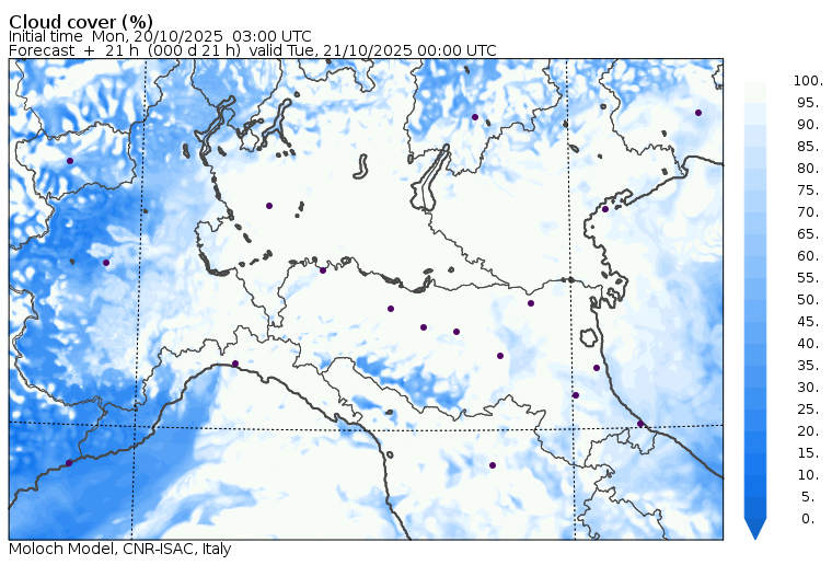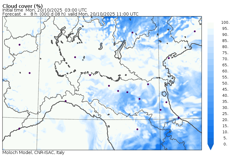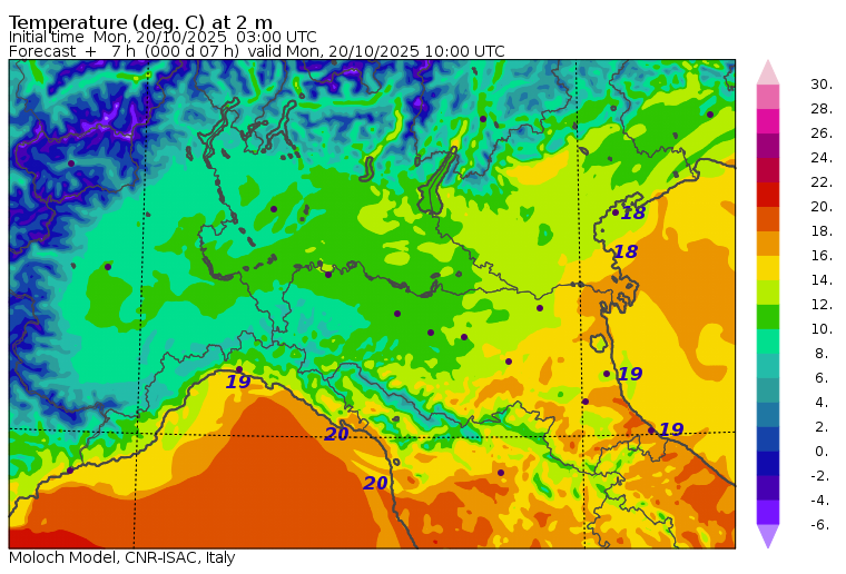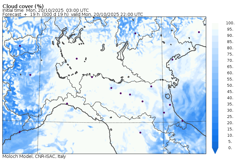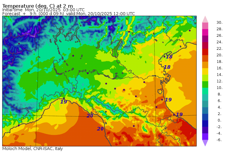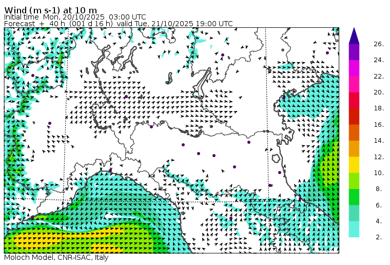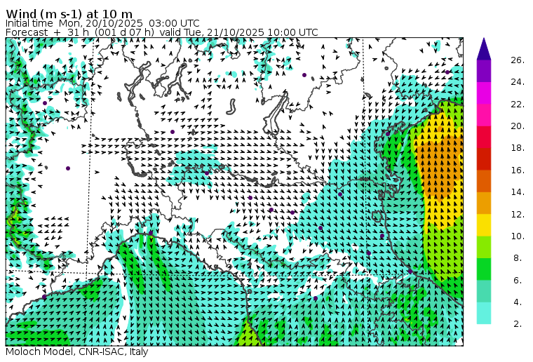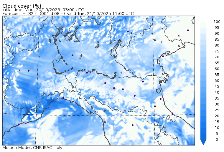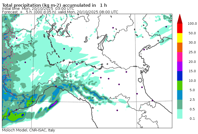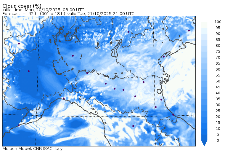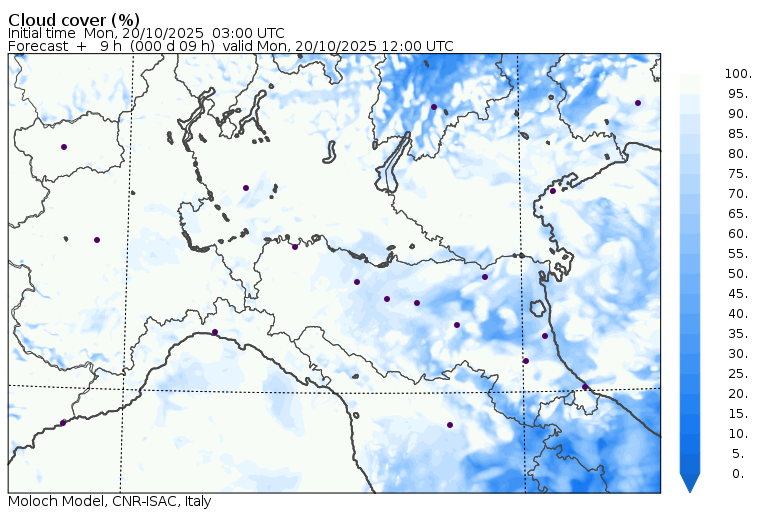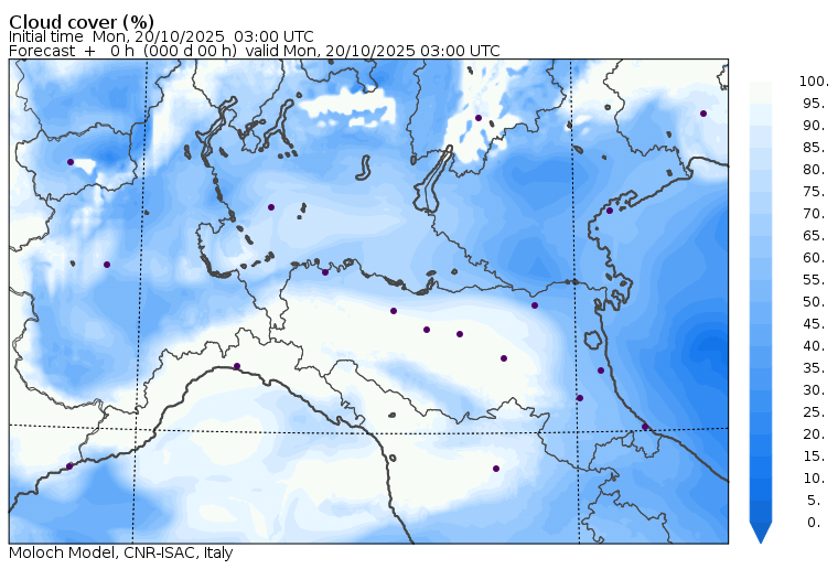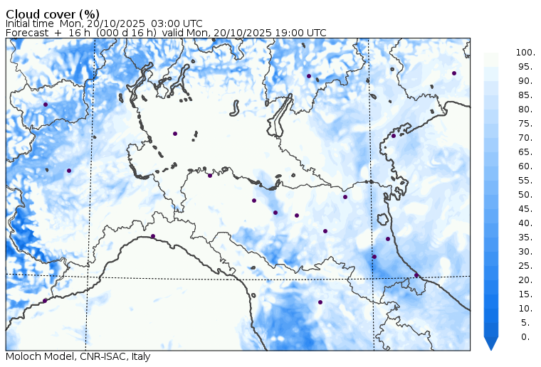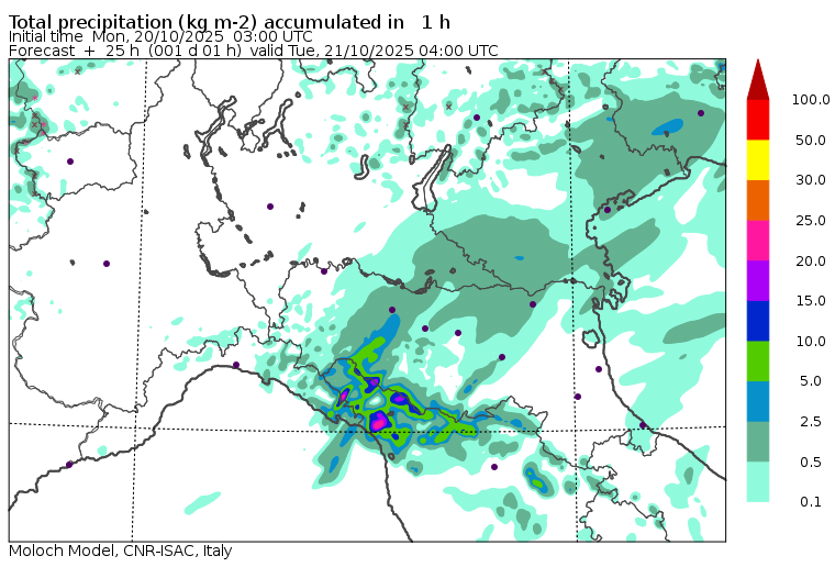 The numerical predictions with validity of two days are derived from MOLOCH model, developed by CNR-ISAC and used at the horizontal resolution of 1.25 km. The initial and boundary conditions for the predictions are obtained from analysis (00:00 UTC) and forecasts by the GFS model of NOAA-NCEP (Global Forecast System del National Centers for Environmental Prediction - National Oceanic and Atmospheric Administration, USA). More details are available at http://www.isac.cnr.it/dinamica/projects/forecasts/index.html.