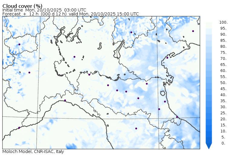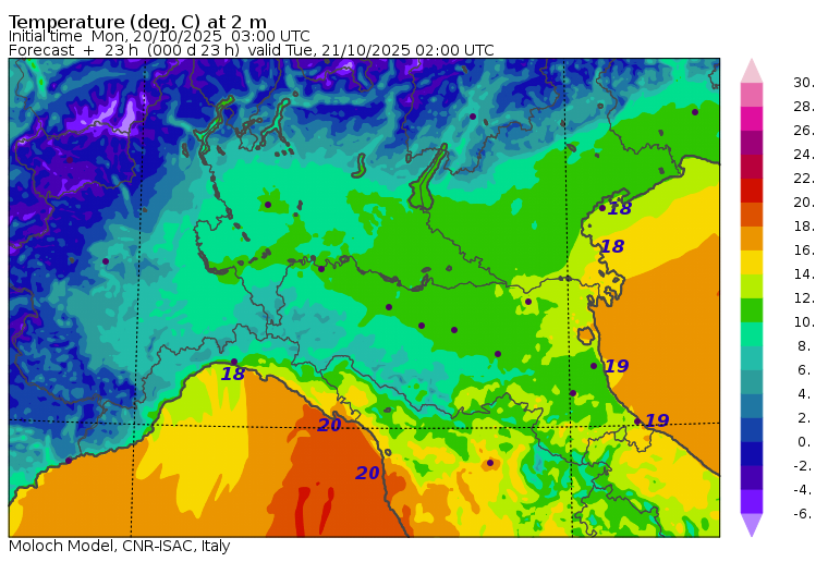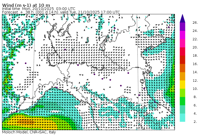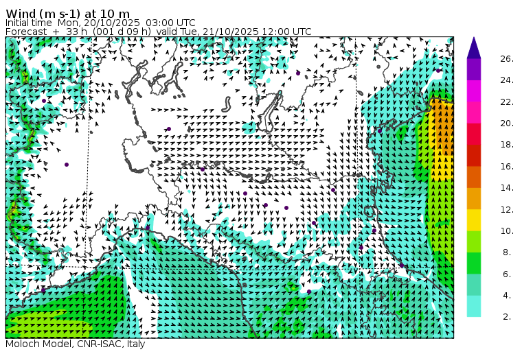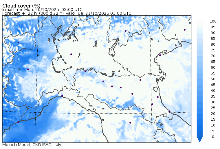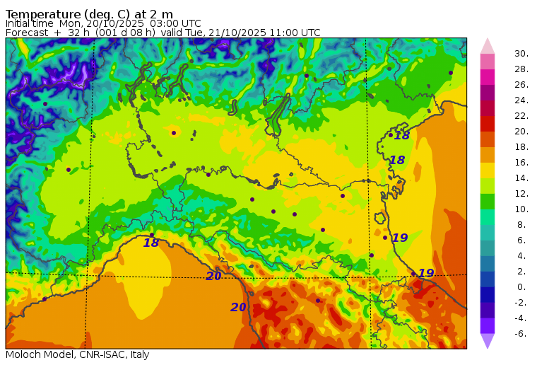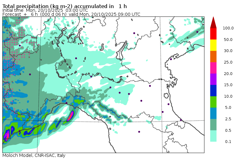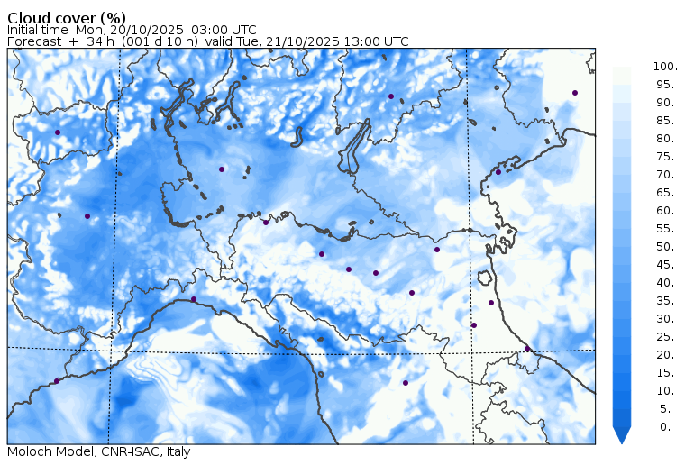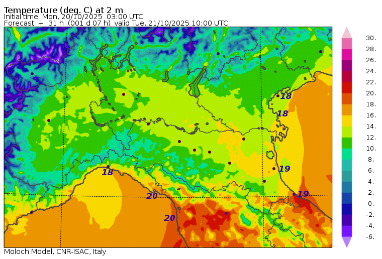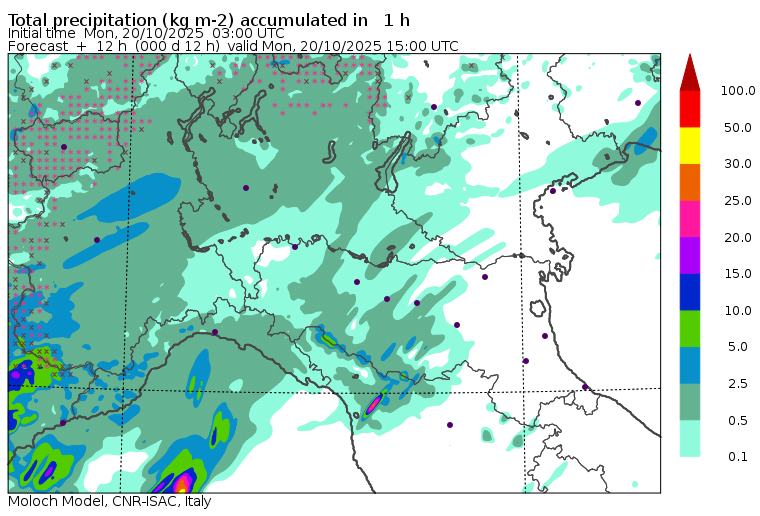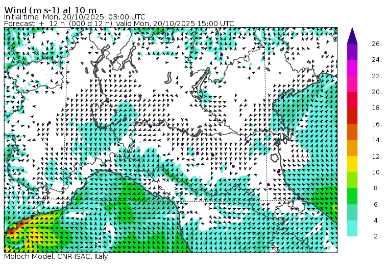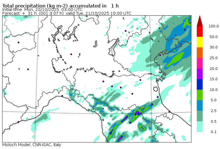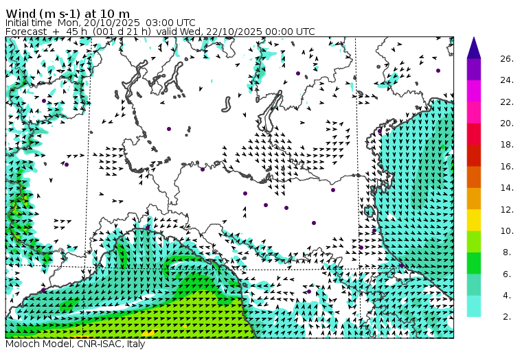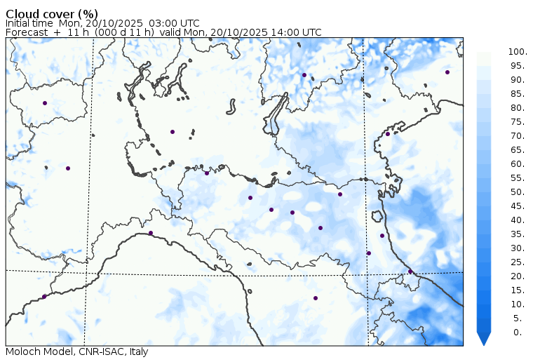 The numerical predictions with validity of two days are derived from MOLOCH model, developed by CNR-ISAC and used at the horizontal resolution of 1.25 km. The initial and boundary conditions for the predictions are obtained from analysis (00:00 UTC) and forecasts by the GFS model of NOAA-NCEP (Global Forecast System del National Centers for Environmental Prediction - National Oceanic and Atmospheric Administration, USA). More details are available at http://www.isac.cnr.it/dinamica/projects/forecasts/index.html.