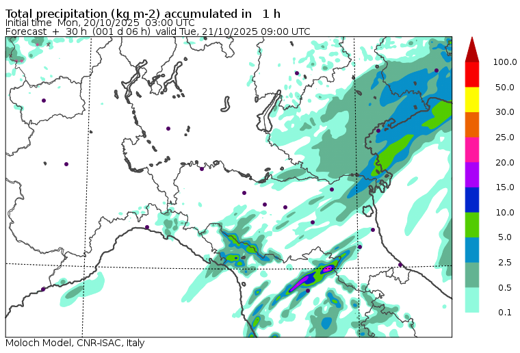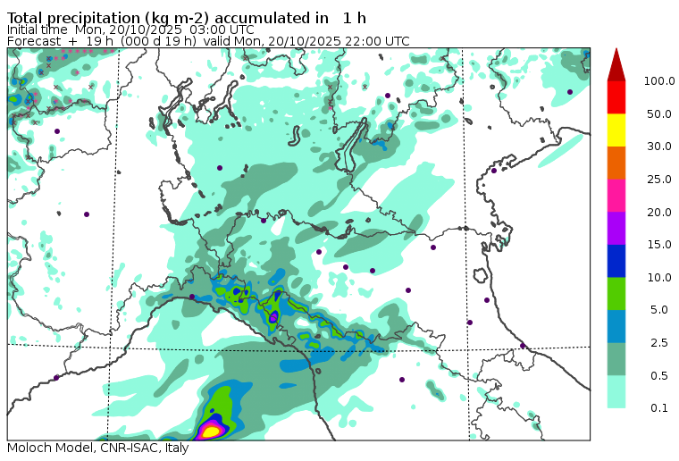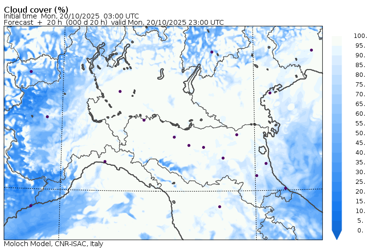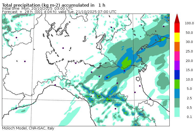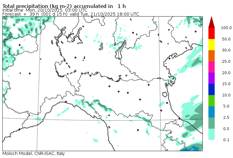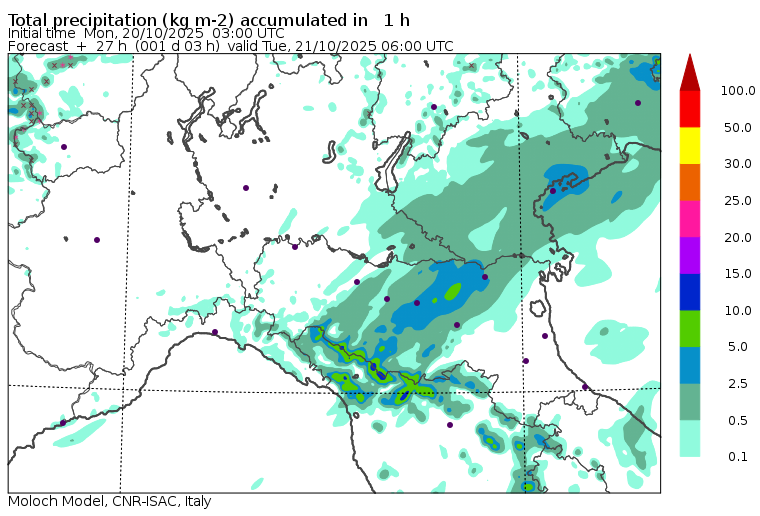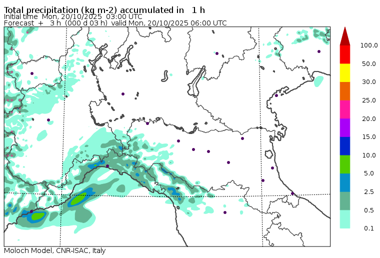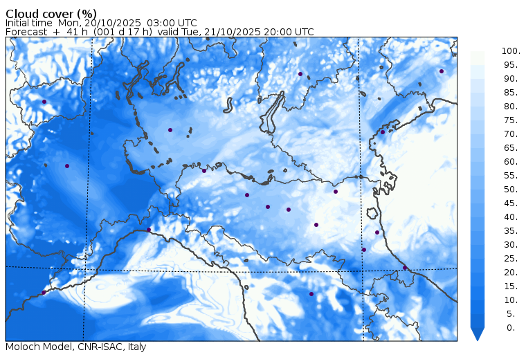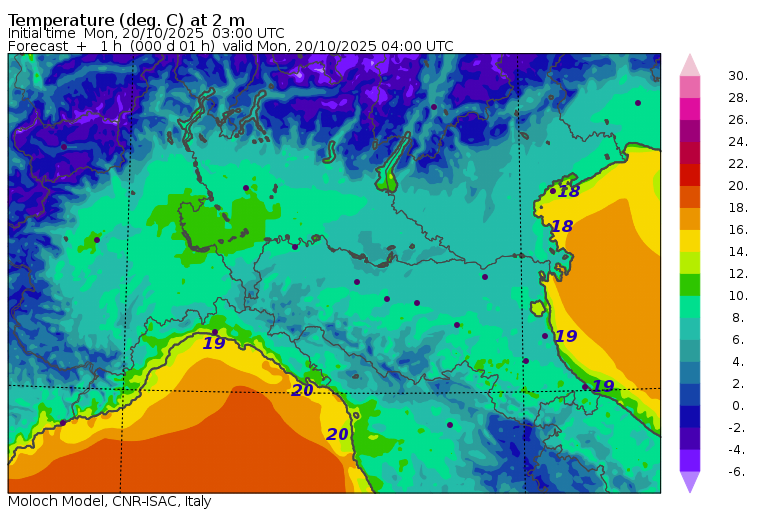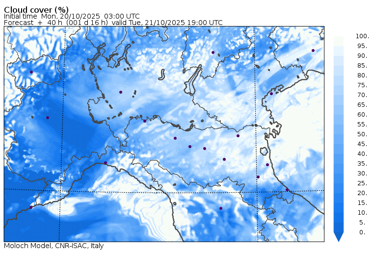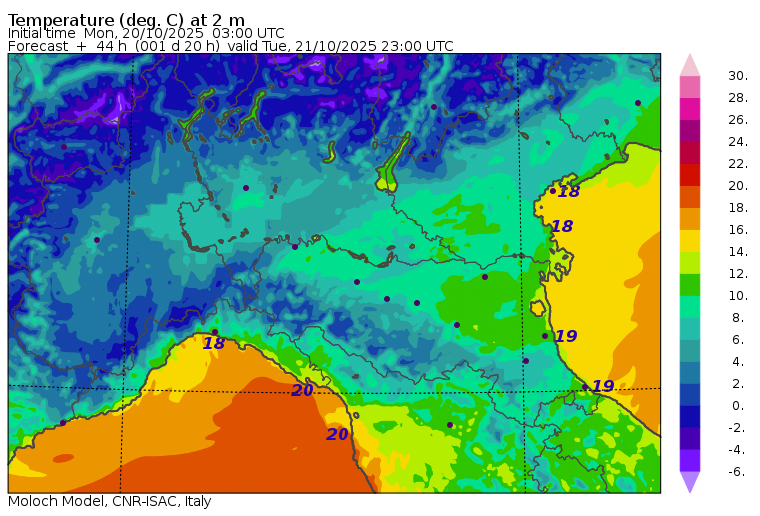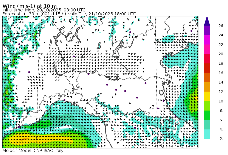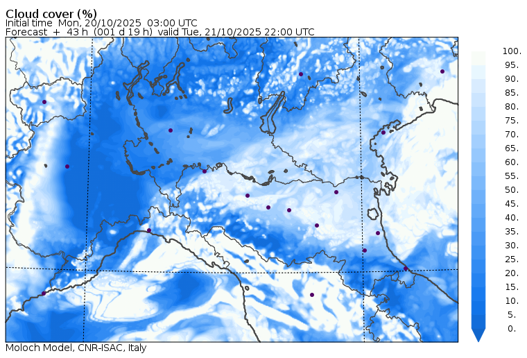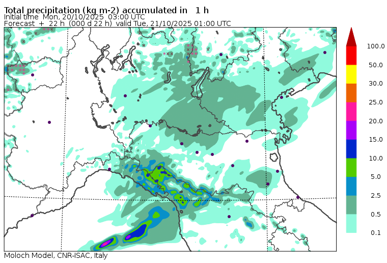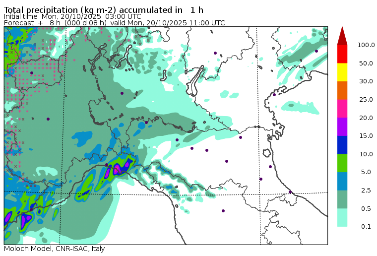 The numerical predictions with validity of two days are derived from MOLOCH model, developed by CNR-ISAC and used at the horizontal resolution of 1.25 km. The initial and boundary conditions for the predictions are obtained from analysis (00:00 UTC) and forecasts by the GFS model of NOAA-NCEP (Global Forecast System del National Centers for Environmental Prediction - National Oceanic and Atmospheric Administration, USA). More details are available at http://www.isac.cnr.it/dinamica/projects/forecasts/index.html.