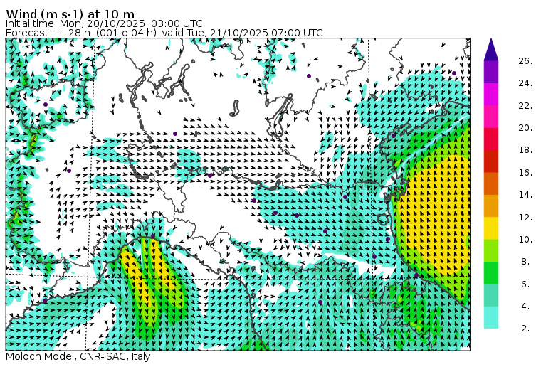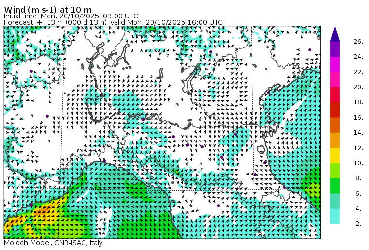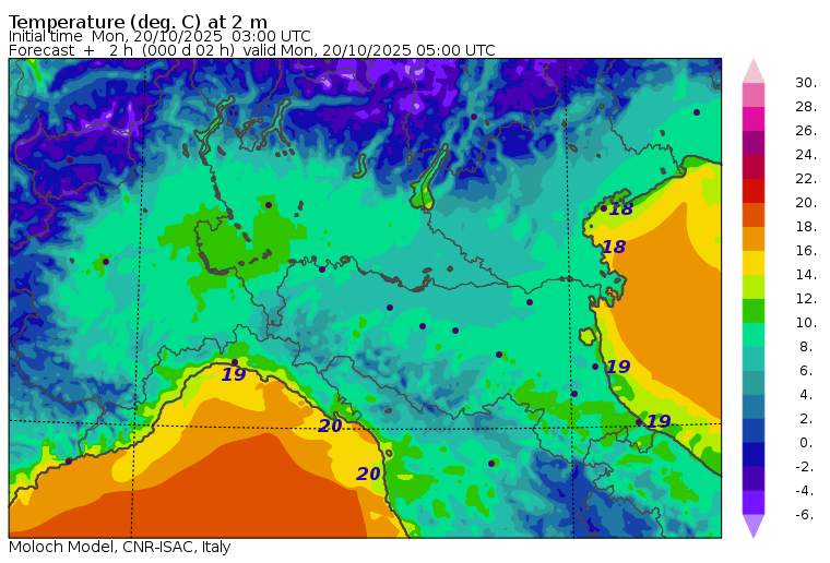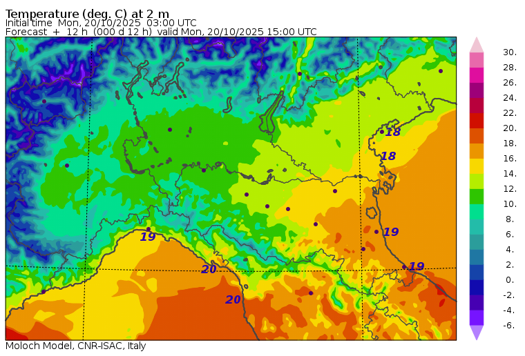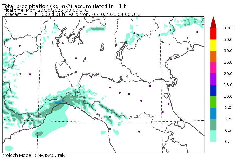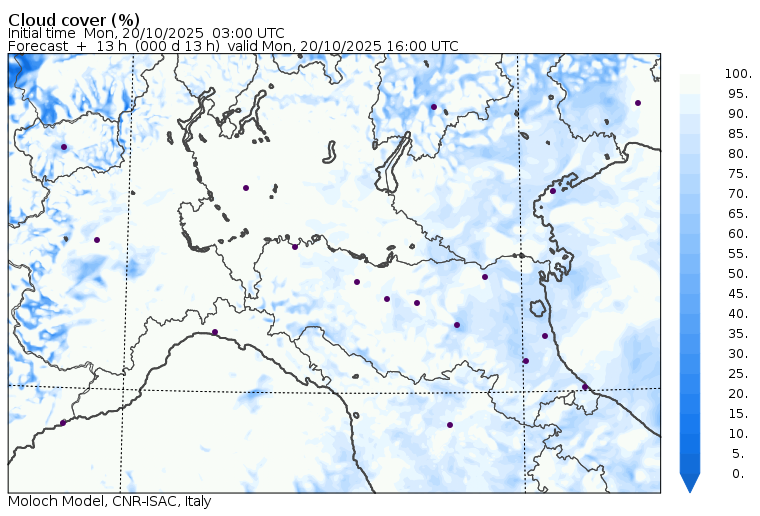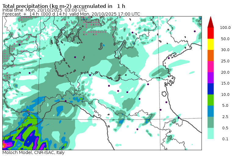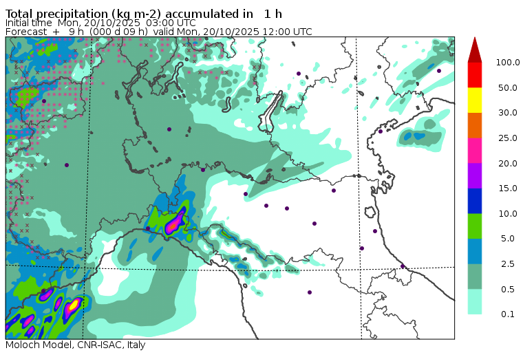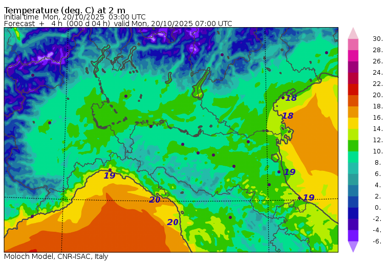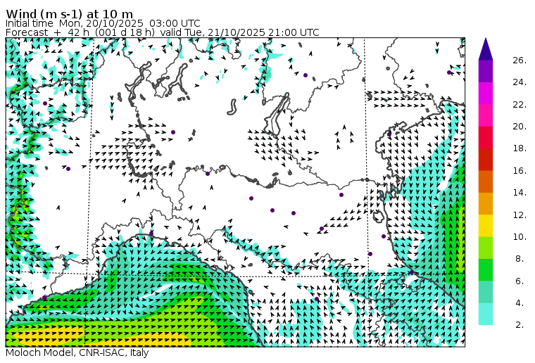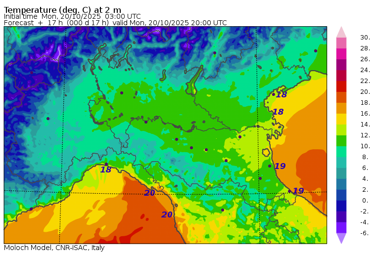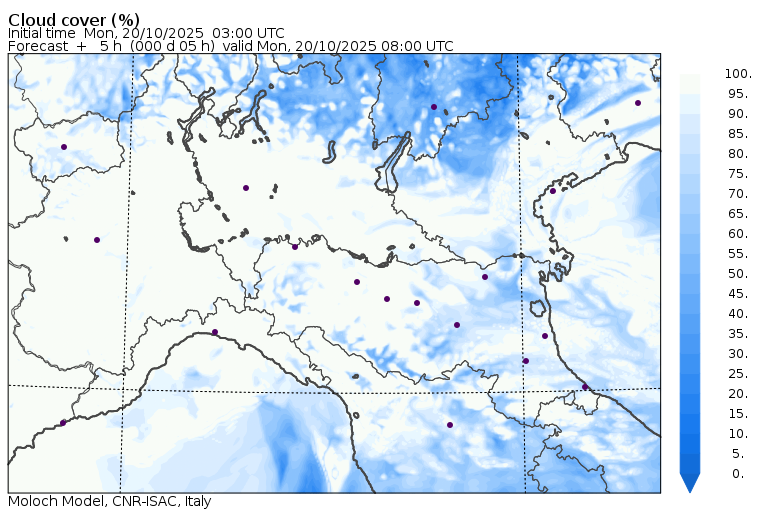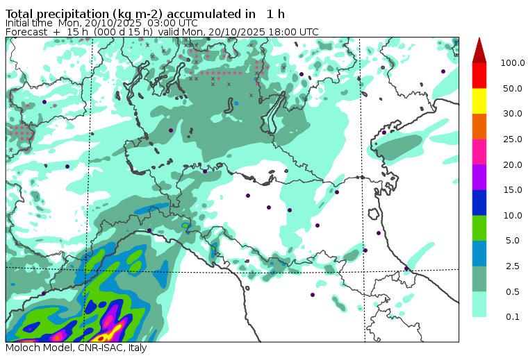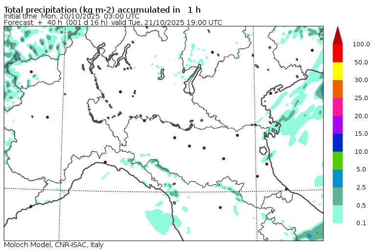 The numerical predictions with validity of two days are derived from MOLOCH model, developed by CNR-ISAC and used at the horizontal resolution of 1.25 km. The initial and boundary conditions for the predictions are obtained from analysis (00:00 UTC) and forecasts by the GFS model of NOAA-NCEP (Global Forecast System del National Centers for Environmental Prediction - National Oceanic and Atmospheric Administration, USA). More details are available at http://www.isac.cnr.it/dinamica/projects/forecasts/index.html.