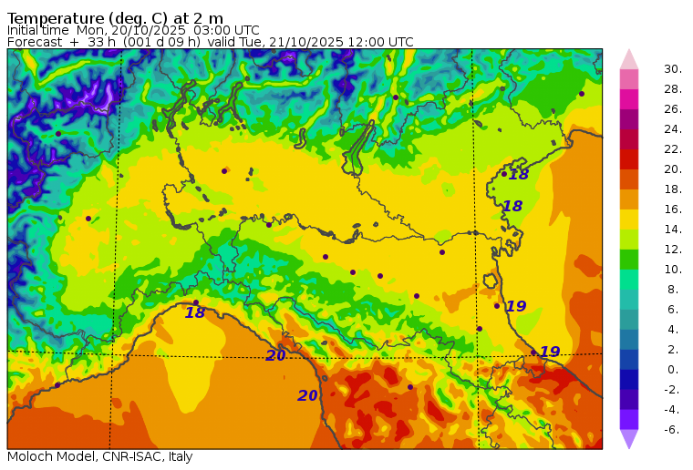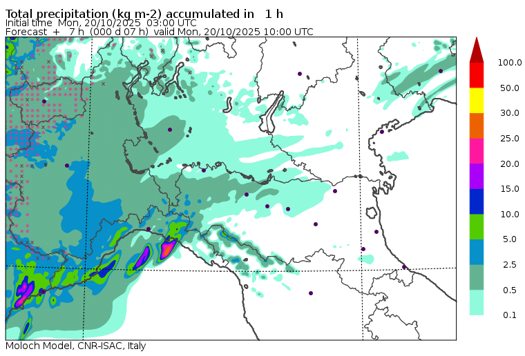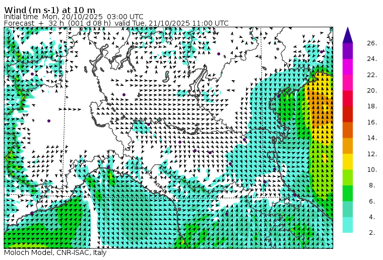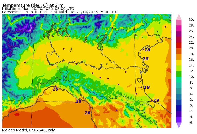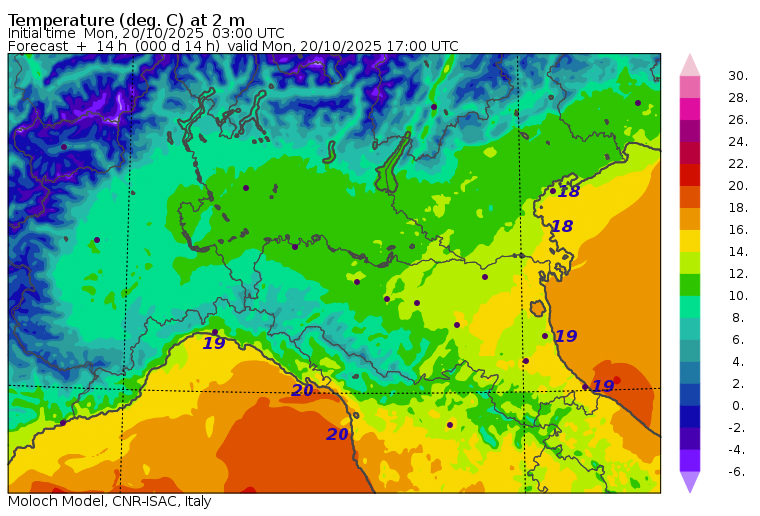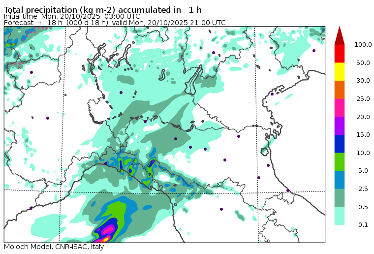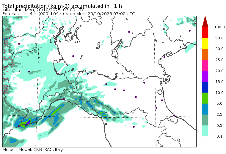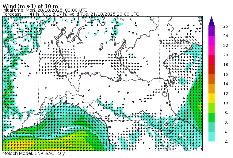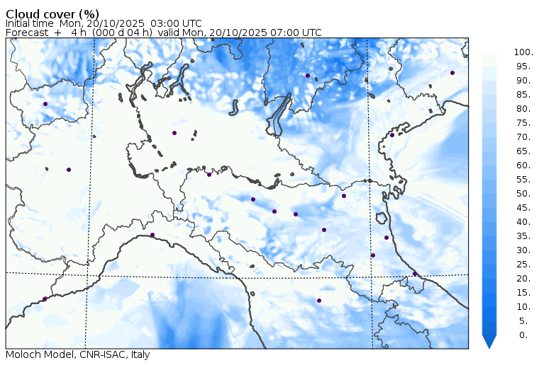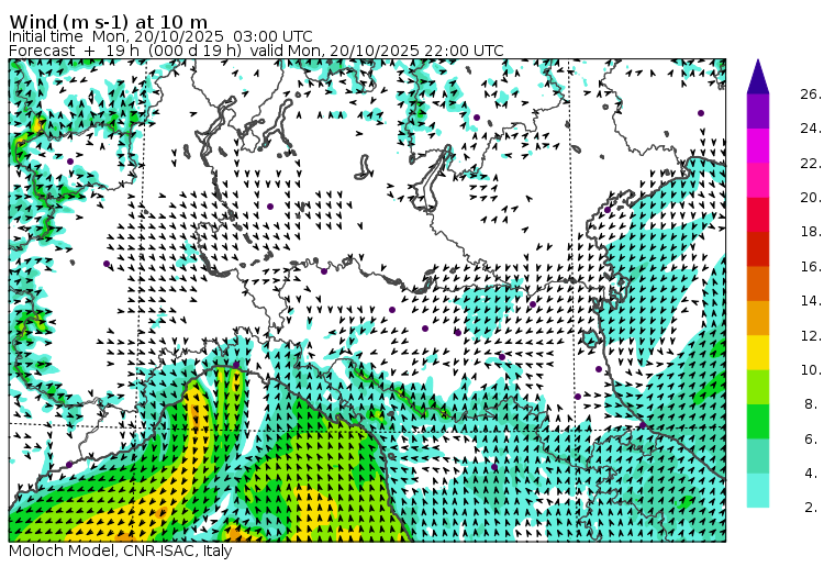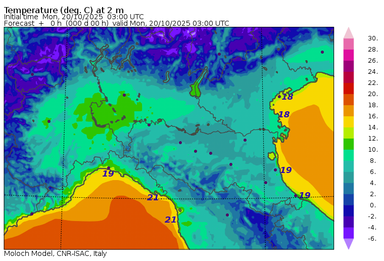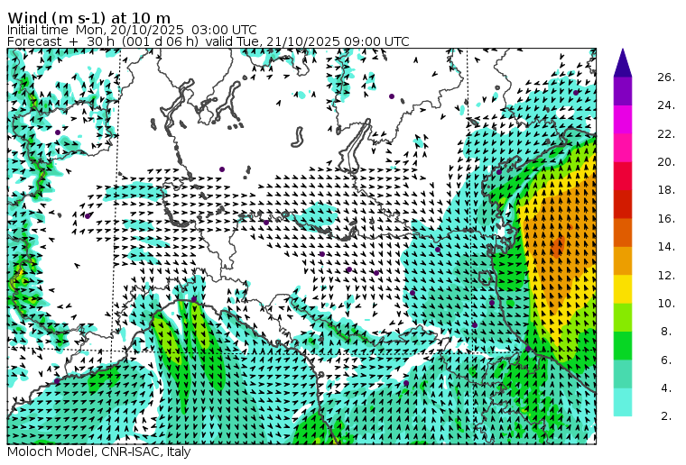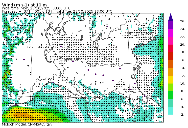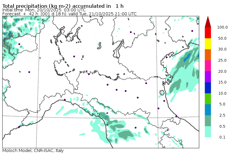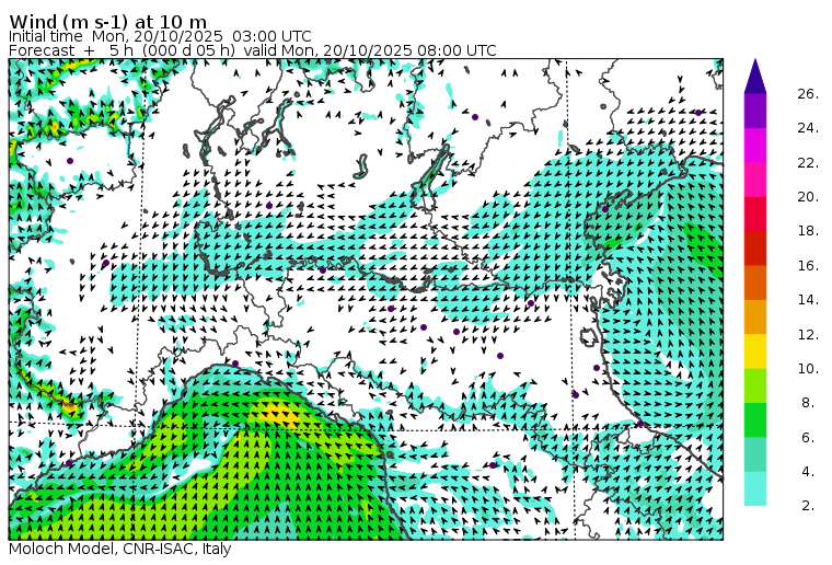 The numerical predictions with validity of two days are derived from MOLOCH model, developed by CNR-ISAC and used at the horizontal resolution of 1.25 km. The initial and boundary conditions for the predictions are obtained from analysis (00:00 UTC) and forecasts by the GFS model of NOAA-NCEP (Global Forecast System del National Centers for Environmental Prediction - National Oceanic and Atmospheric Administration, USA). More details are available at http://www.isac.cnr.it/dinamica/projects/forecasts/index.html.