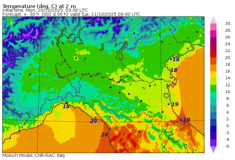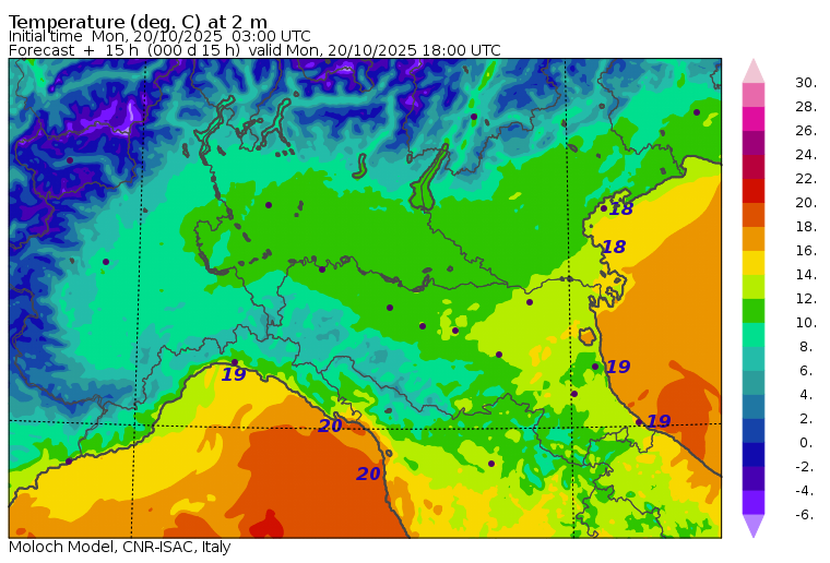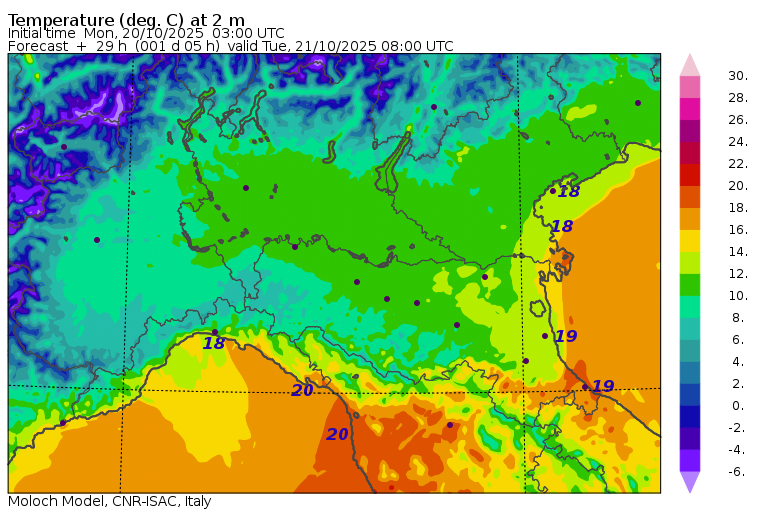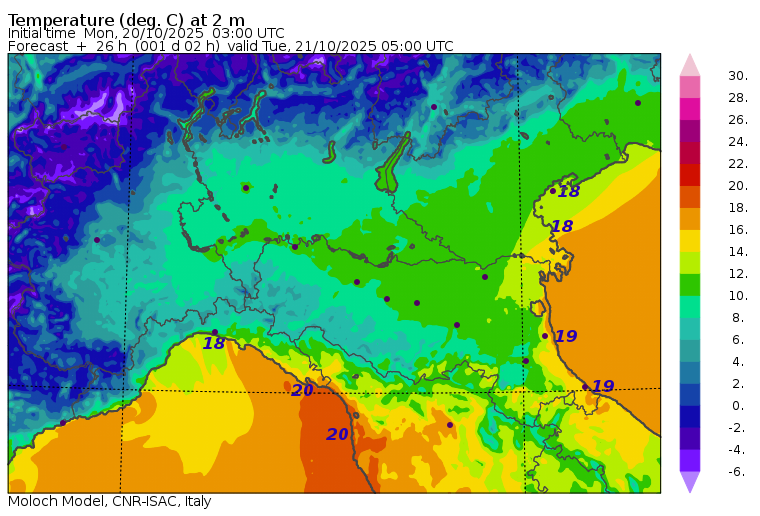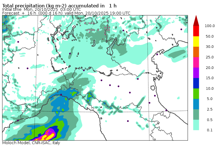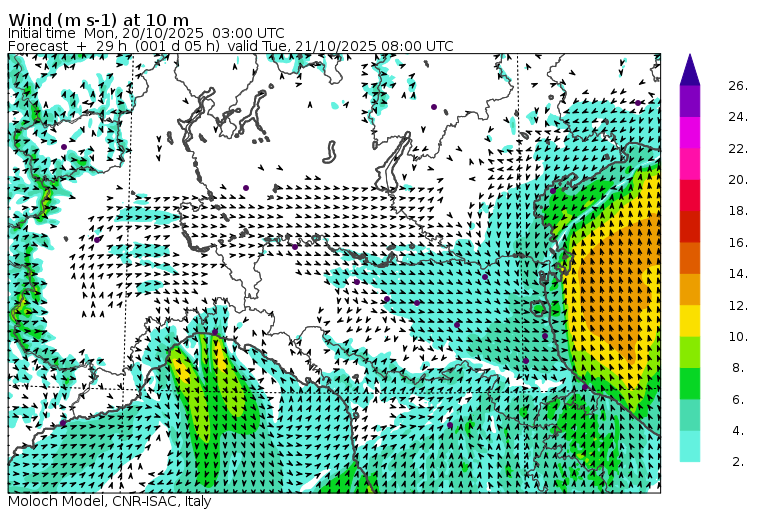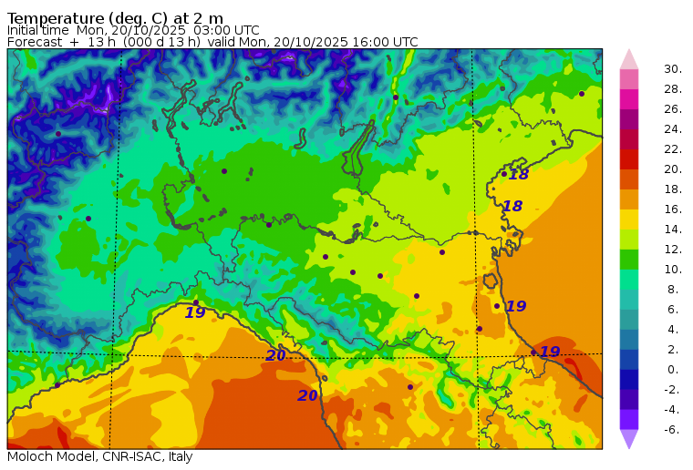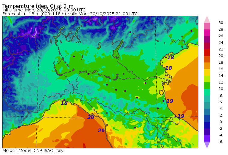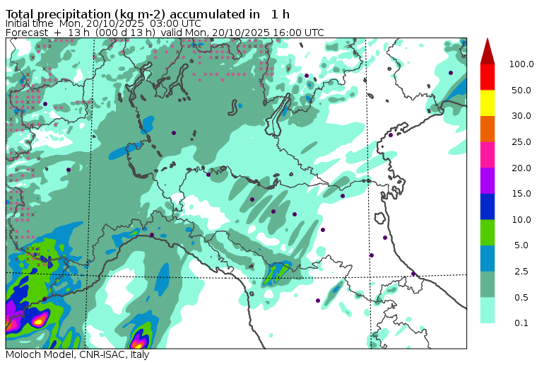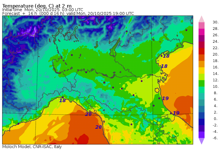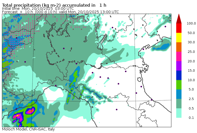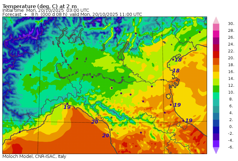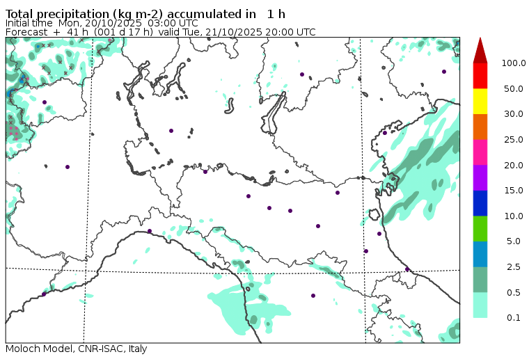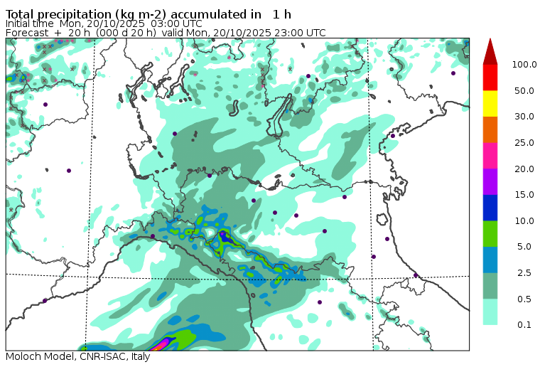 The numerical predictions with validity of two days are derived from MOLOCH model, developed by CNR-ISAC and used at the horizontal resolution of 1.25 km. The initial and boundary conditions for the predictions are obtained from analysis (00:00 UTC) and forecasts by the GFS model of NOAA-NCEP (Global Forecast System del National Centers for Environmental Prediction - National Oceanic and Atmospheric Administration, USA). More details are available at http://www.isac.cnr.it/dinamica/projects/forecasts/index.html.