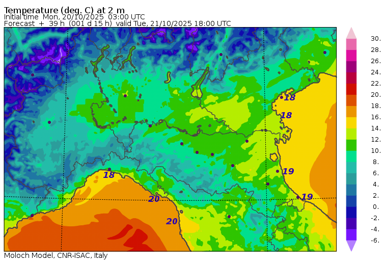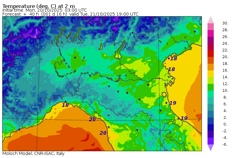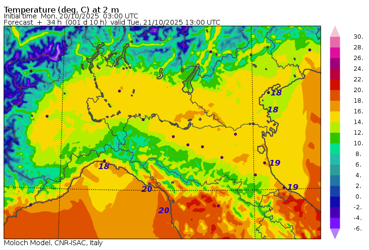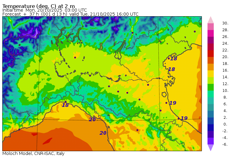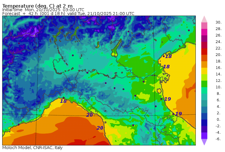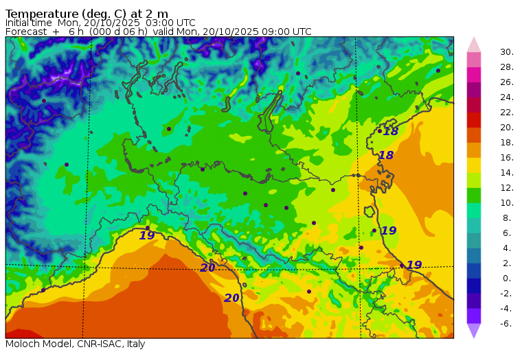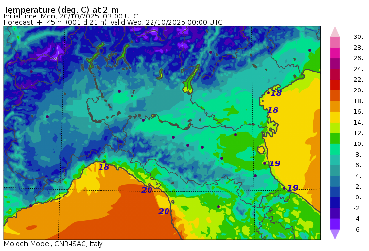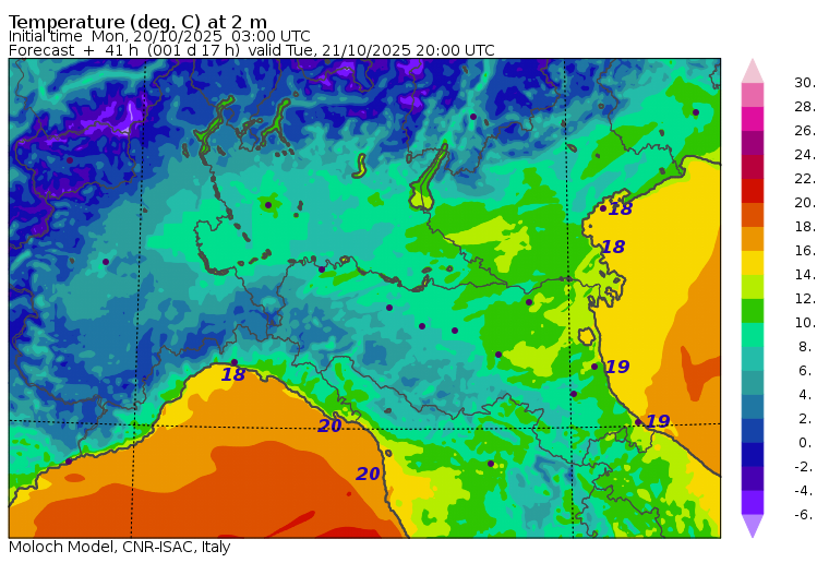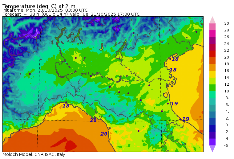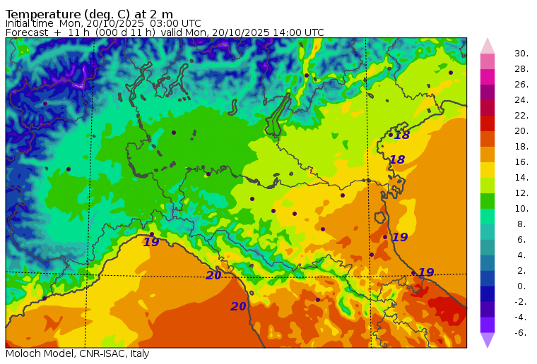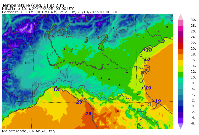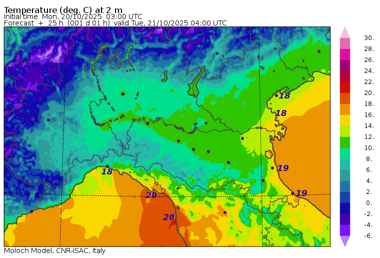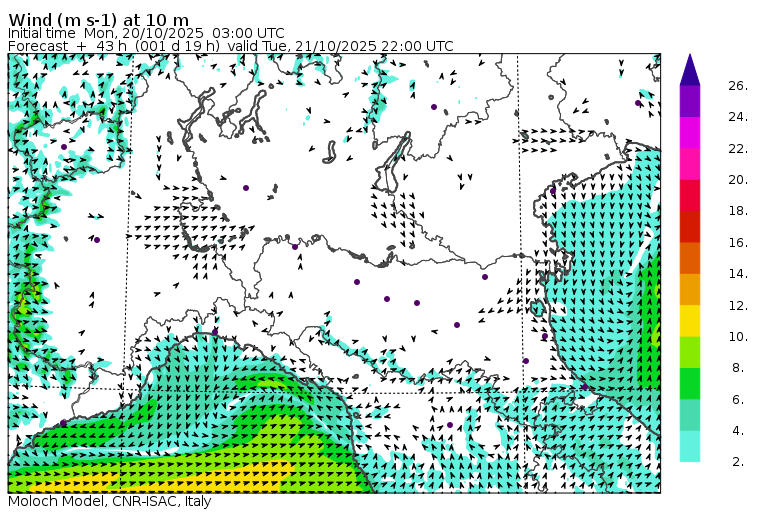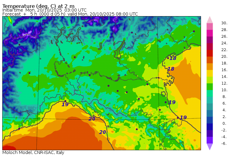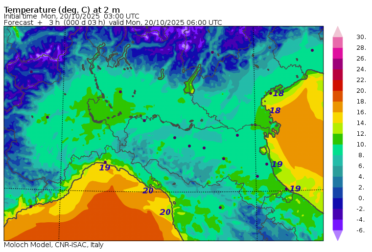 The numerical predictions with validity of two days are derived from MOLOCH model, developed by CNR-ISAC and used at the horizontal resolution of 1.25 km. The initial and boundary conditions for the predictions are obtained from analysis (00:00 UTC) and forecasts by the GFS model of NOAA-NCEP (Global Forecast System del National Centers for Environmental Prediction - National Oceanic and Atmospheric Administration, USA). More details are available at http://www.isac.cnr.it/dinamica/projects/forecasts/index.html.