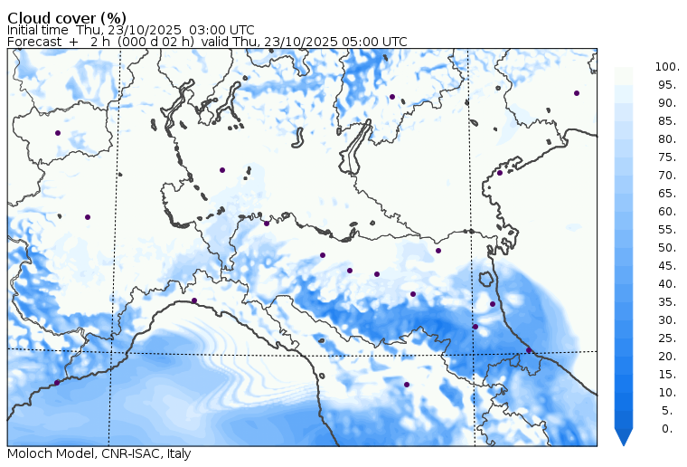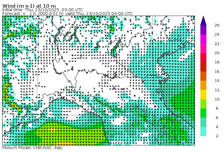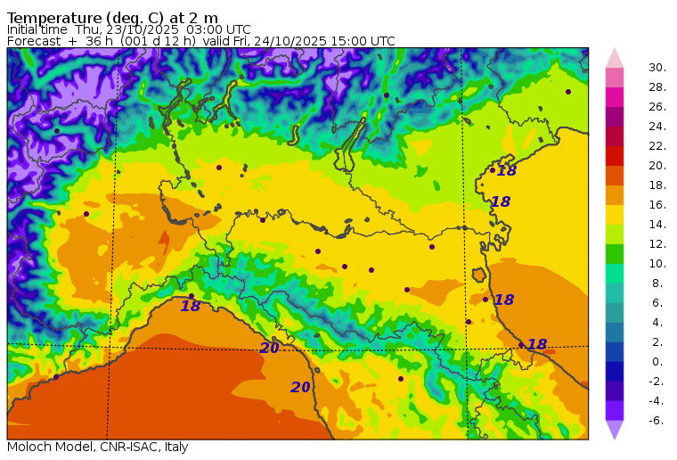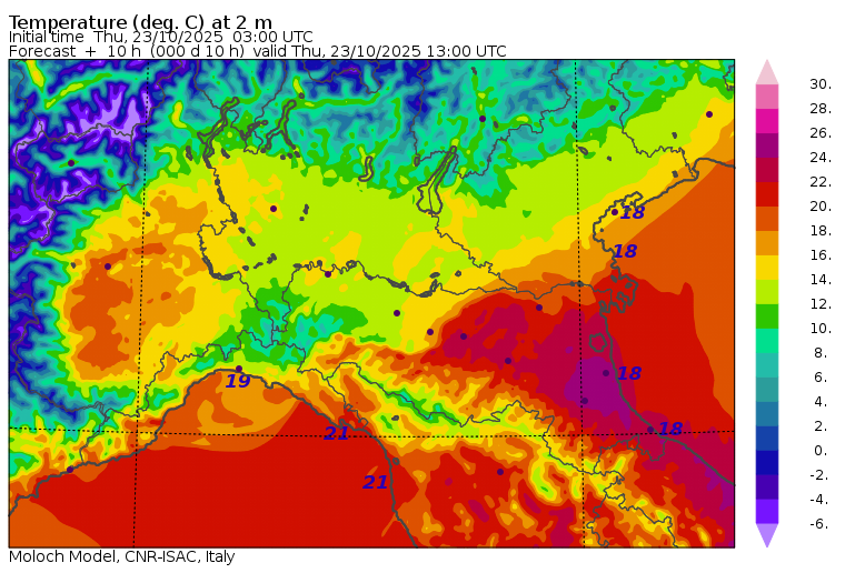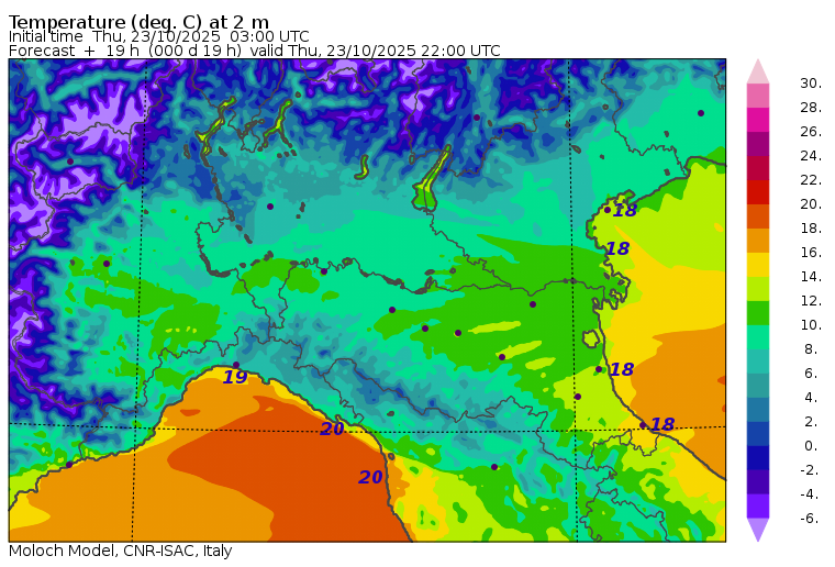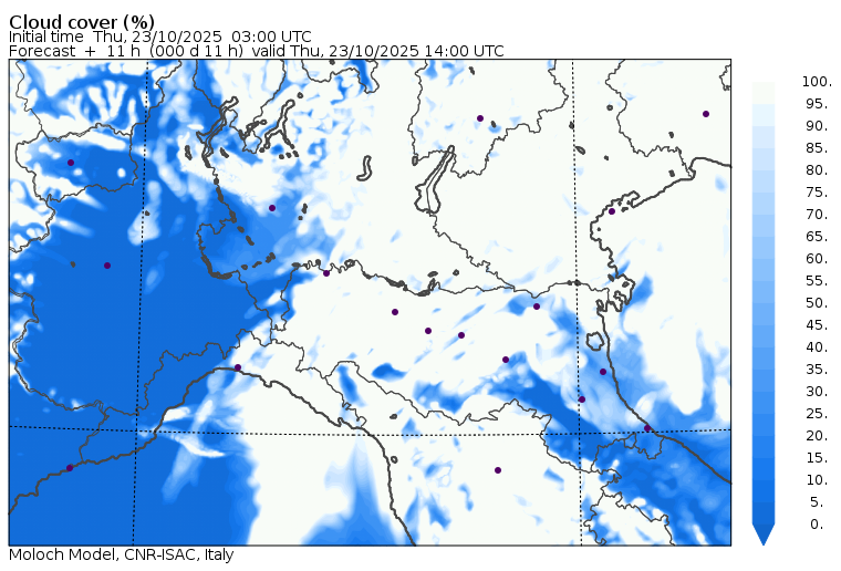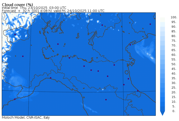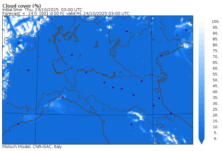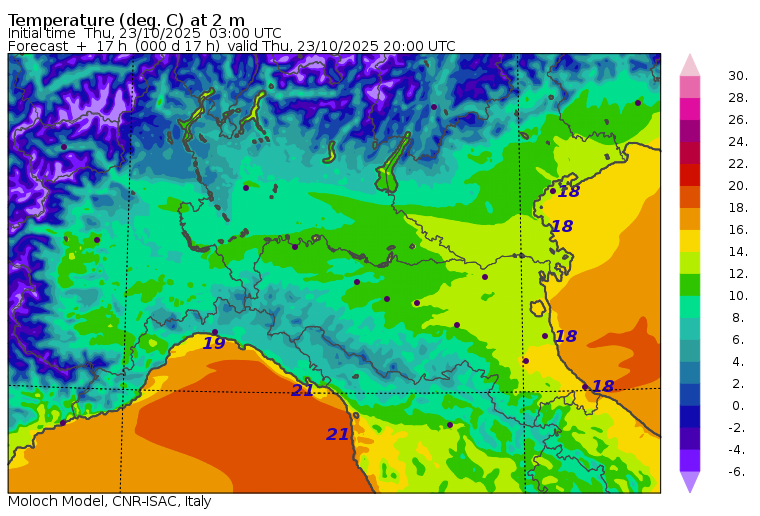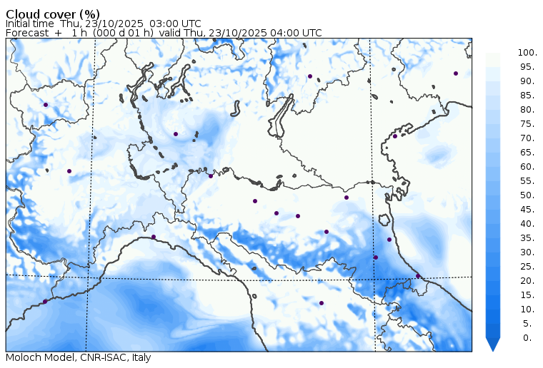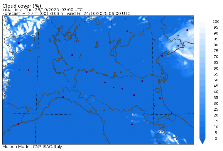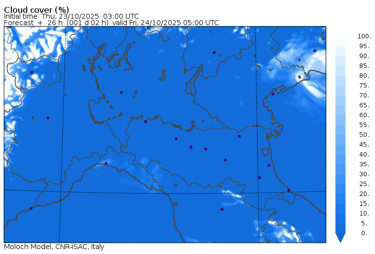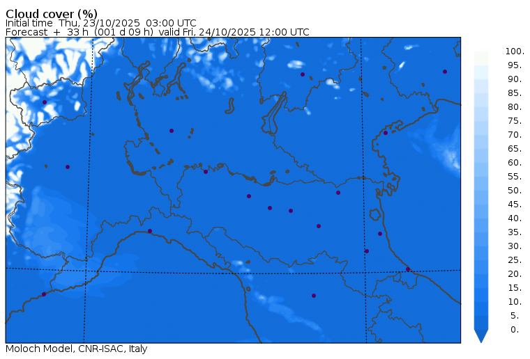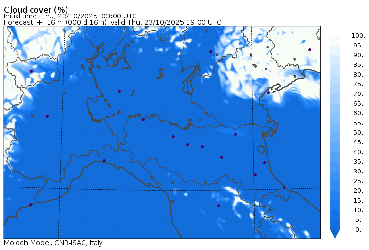 The observed data are acquired by means of a weather station IRDAM WST 7000, installed at 2 m above the lawn, west of the ISAC building. The numerical predictions with validity of two days are derived from MOLOCH model, developed by CNR-ISAC and used at the horizontal resolution of 1.25 km. The initial and boundary conditions for the predictions are obtained from analysis (00:00 UTC) and forecasts by the GFS model of NOAA-NCEP (Global Forecast System del National Centers for Environmental Prediction - National Oceanic and Atmospheric Administration, USA). More details are available at http://www.isac.cnr.it/dinamica/projects/forecasts/index.html. For the assessment of the latest monthly/seasonal/annual anomaly within the context of the last two centuries of climate variability see the link http://www.isac.cnr.it/climstor/climate_news.html. The information and graphics on this site are generated using raw data and not validated. Therefore this information is provided as-is and is not guaranteed in their accuracy and / or completeness. The conclusions derived from the contents of the site are solely of responsibility of the users who have formulated. The CNR is not liable for improper use of the information provided on this website. For info: infometeobologna @ isac.cnr.it beta version |