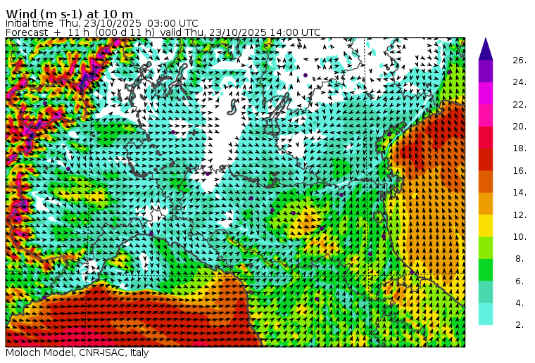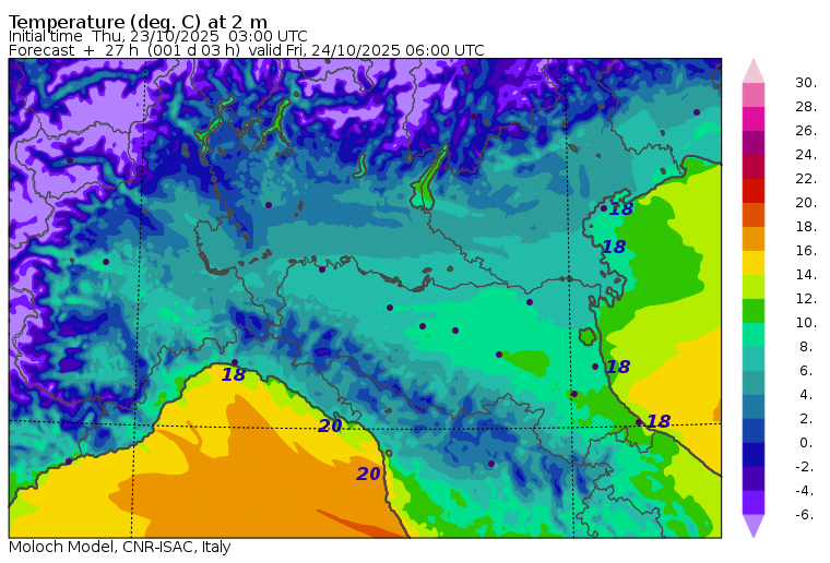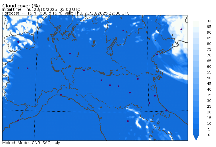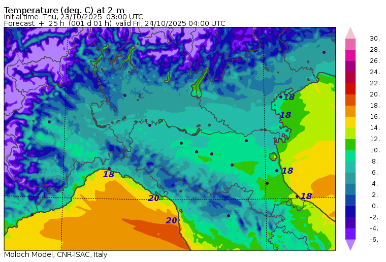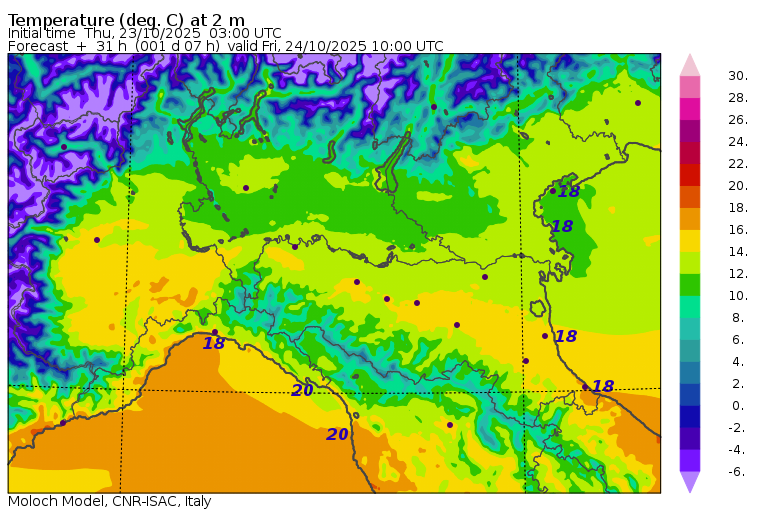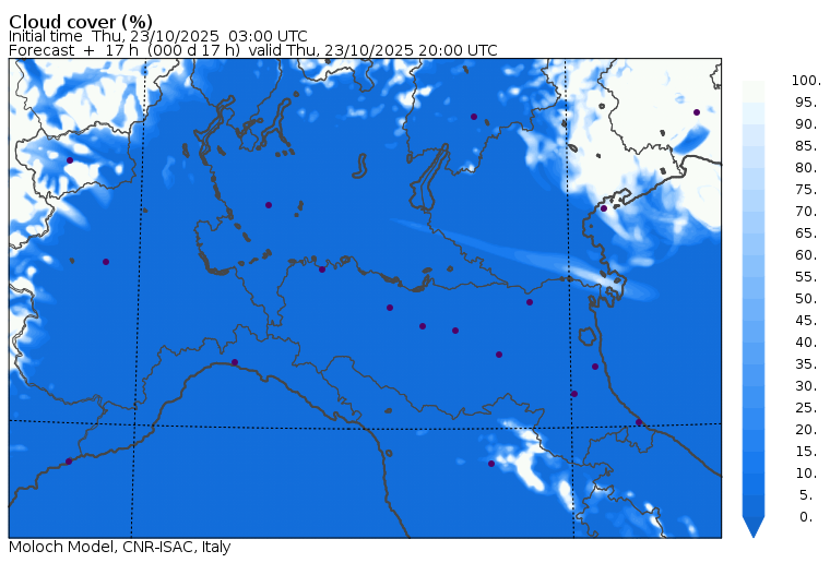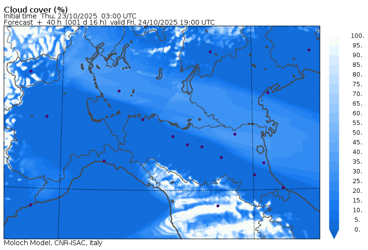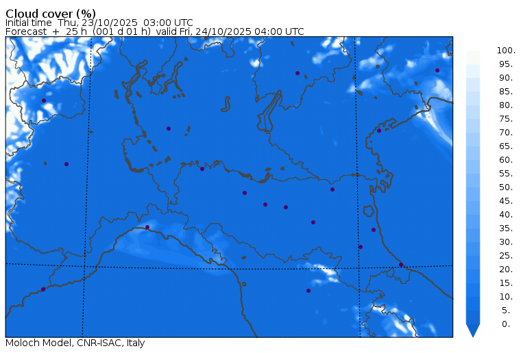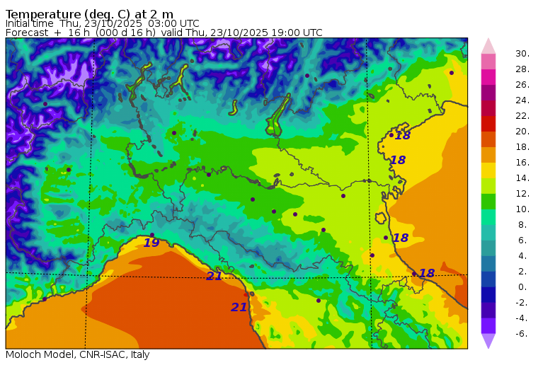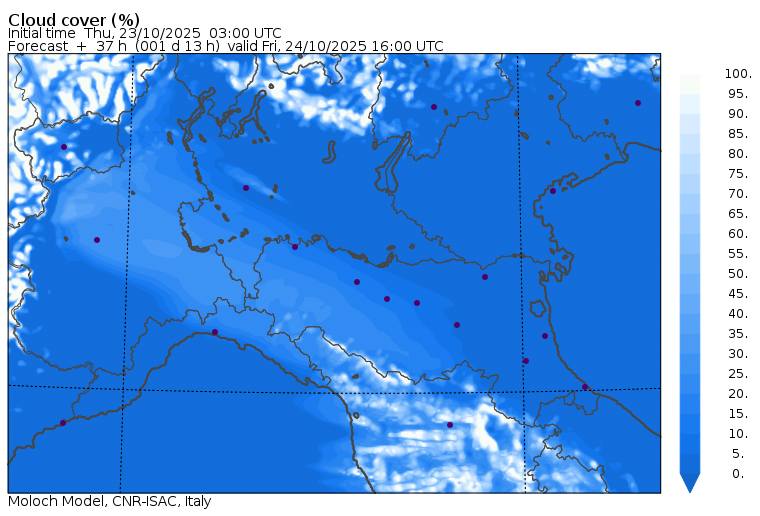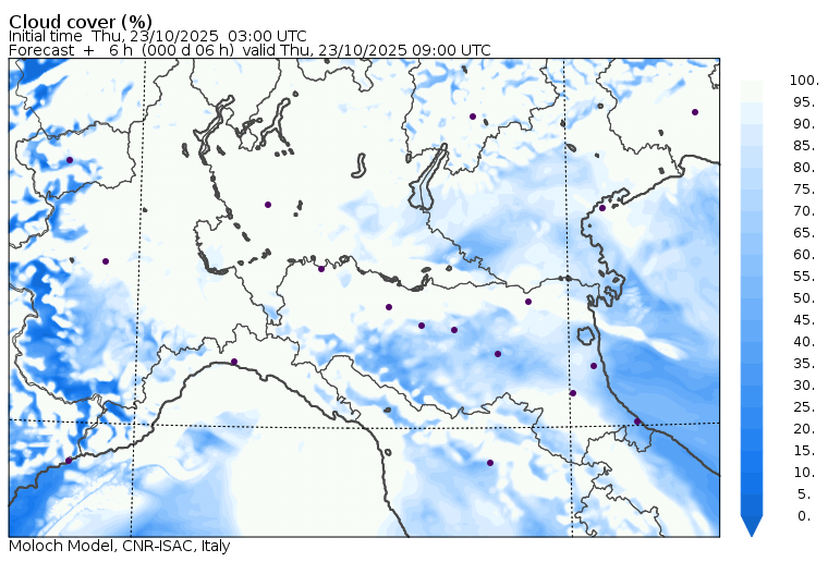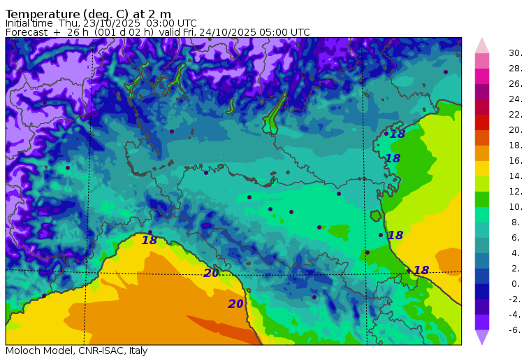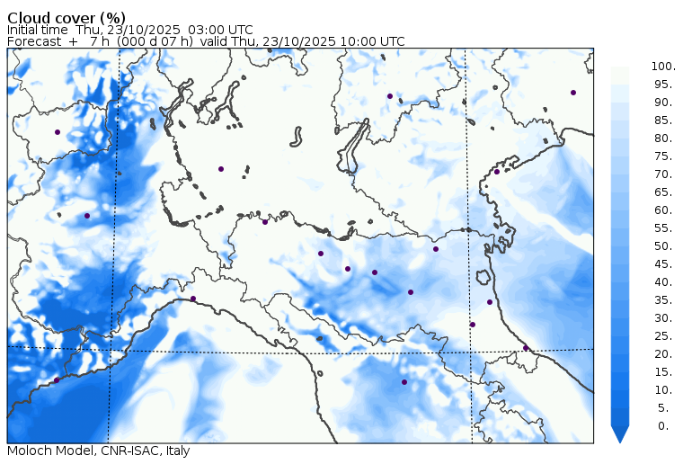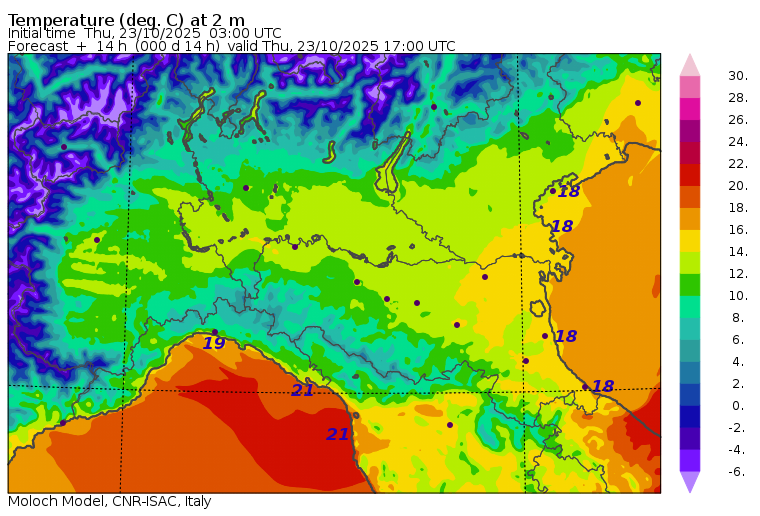 The observed data are acquired by means of a weather station IRDAM WST 7000, installed at 2 m above the lawn, west of the ISAC building. The numerical predictions with validity of two days are derived from MOLOCH model, developed by CNR-ISAC and used at the horizontal resolution of 1.25 km. The initial and boundary conditions for the predictions are obtained from analysis (00:00 UTC) and forecasts by the GFS model of NOAA-NCEP (Global Forecast System del National Centers for Environmental Prediction - National Oceanic and Atmospheric Administration, USA). More details are available at http://www.isac.cnr.it/dinamica/projects/forecasts/index.html. For the assessment of the latest monthly/seasonal/annual anomaly within the context of the last two centuries of climate variability see the link http://www.isac.cnr.it/climstor/climate_news.html. The information and graphics on this site are generated using raw data and not validated. Therefore this information is provided as-is and is not guaranteed in their accuracy and / or completeness. The conclusions derived from the contents of the site are solely of responsibility of the users who have formulated. The CNR is not liable for improper use of the information provided on this website. For info: infometeobologna @ isac.cnr.it beta version |