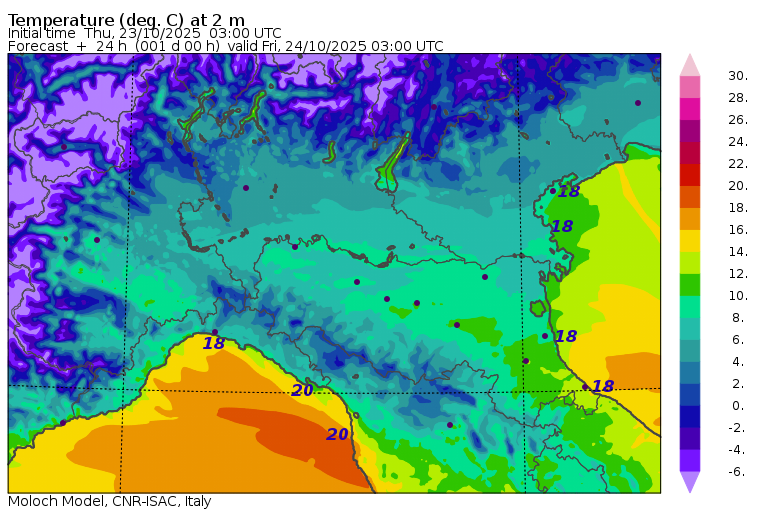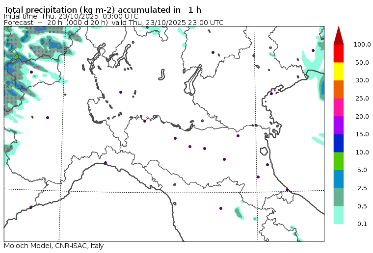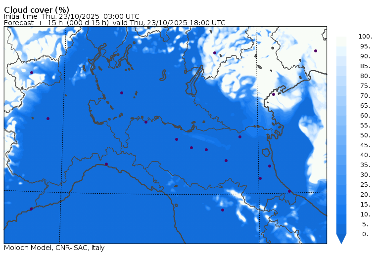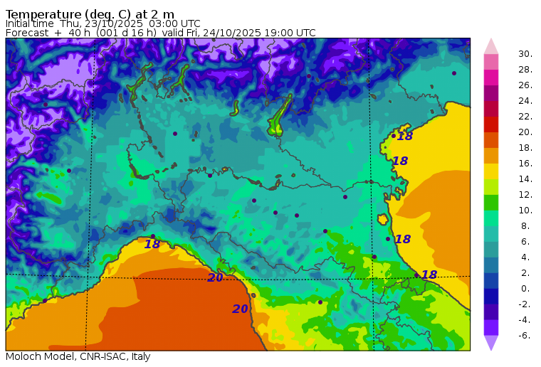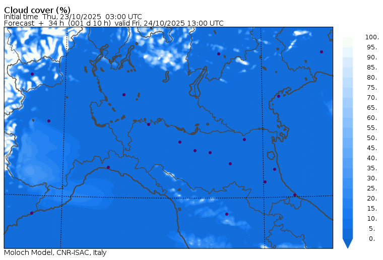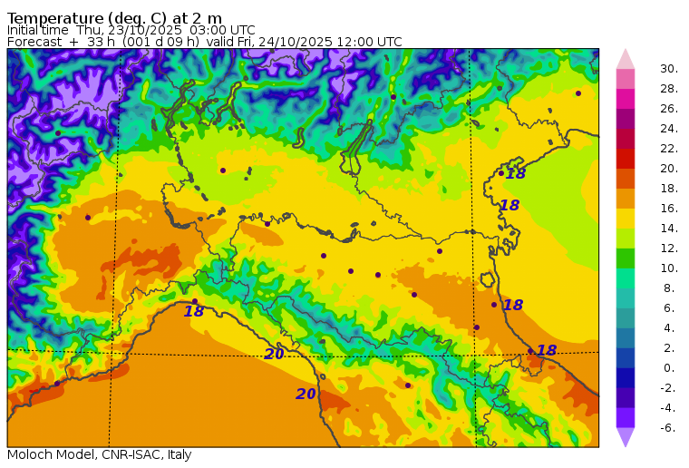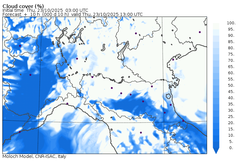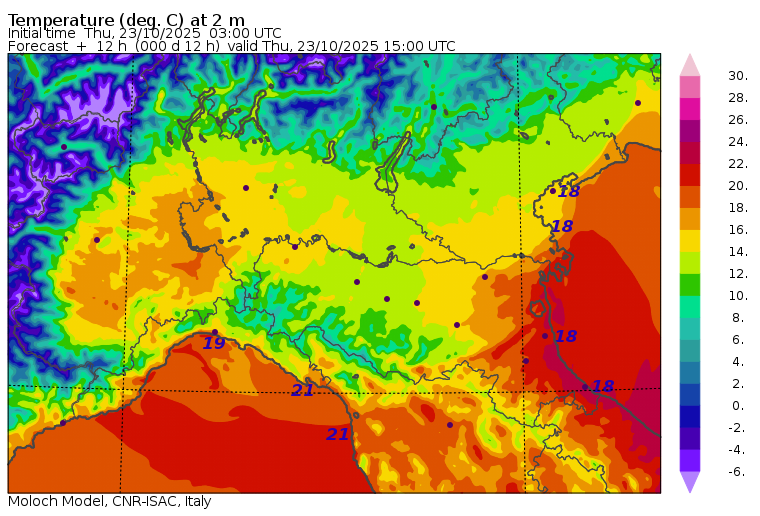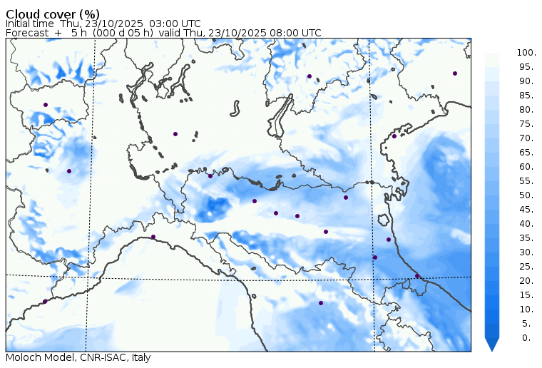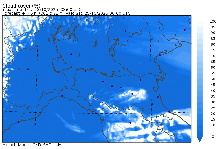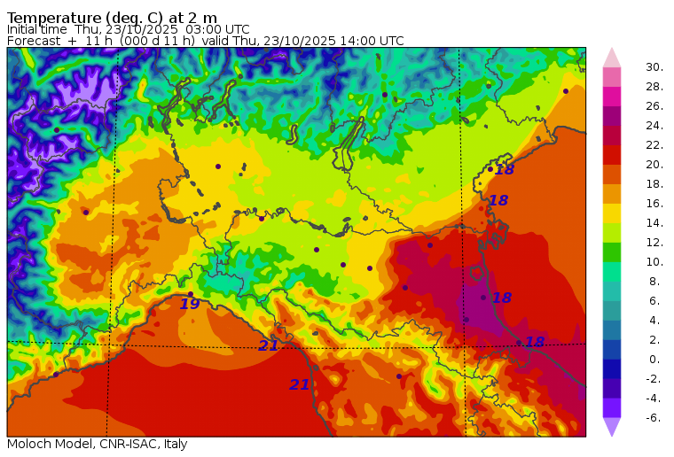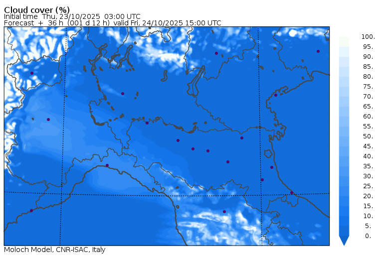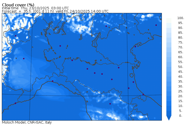 The observed data are acquired by means of a weather station IRDAM WST 7000, installed at 2 m above the lawn, west of the ISAC building. The numerical predictions with validity of two days are derived from MOLOCH model, developed by CNR-ISAC and used at the horizontal resolution of 1.25 km. The initial and boundary conditions for the predictions are obtained from analysis (00:00 UTC) and forecasts by the GFS model of NOAA-NCEP (Global Forecast System del National Centers for Environmental Prediction - National Oceanic and Atmospheric Administration, USA). More details are available at http://www.isac.cnr.it/dinamica/projects/forecasts/index.html. For the assessment of the latest monthly/seasonal/annual anomaly within the context of the last two centuries of climate variability see the link http://www.isac.cnr.it/climstor/climate_news.html. The information and graphics on this site are generated using raw data and not validated. Therefore this information is provided as-is and is not guaranteed in their accuracy and / or completeness. The conclusions derived from the contents of the site are solely of responsibility of the users who have formulated. The CNR is not liable for improper use of the information provided on this website. For info: infometeobologna @ isac.cnr.it beta version |