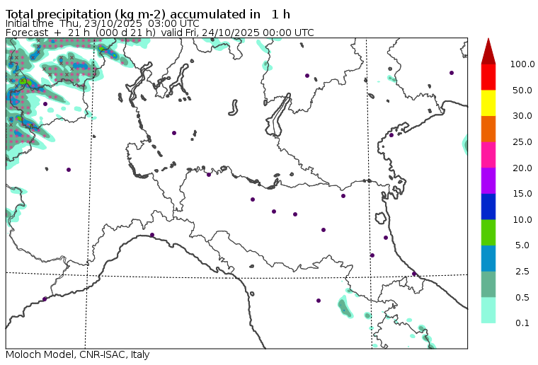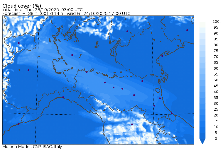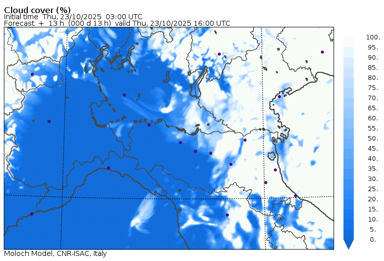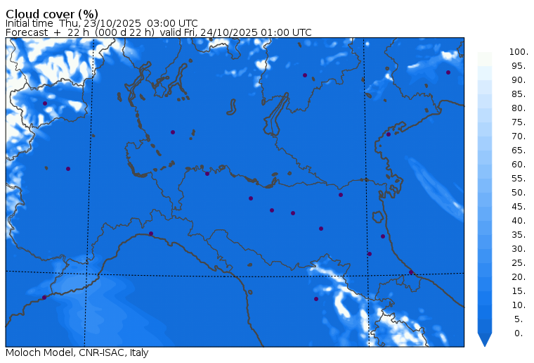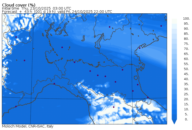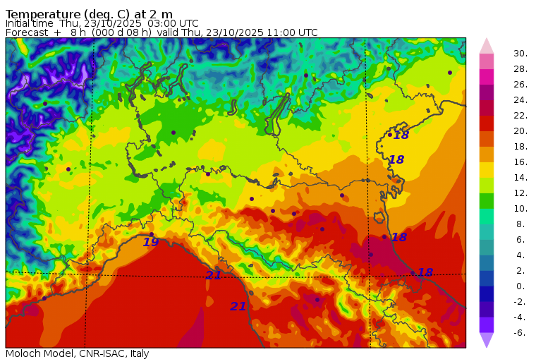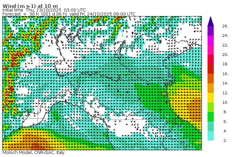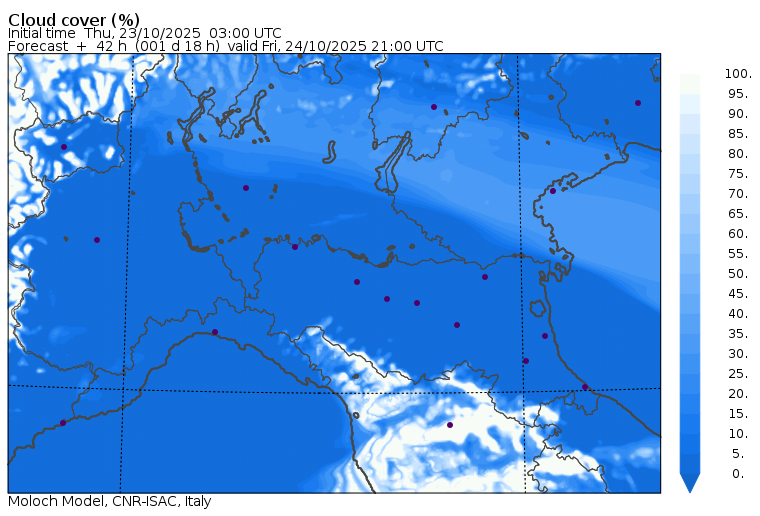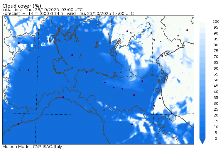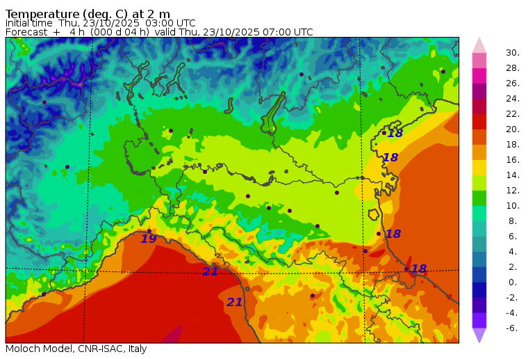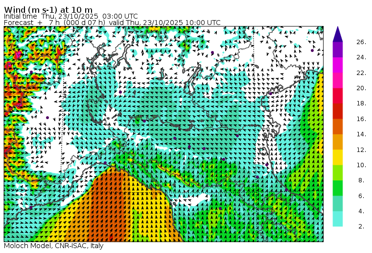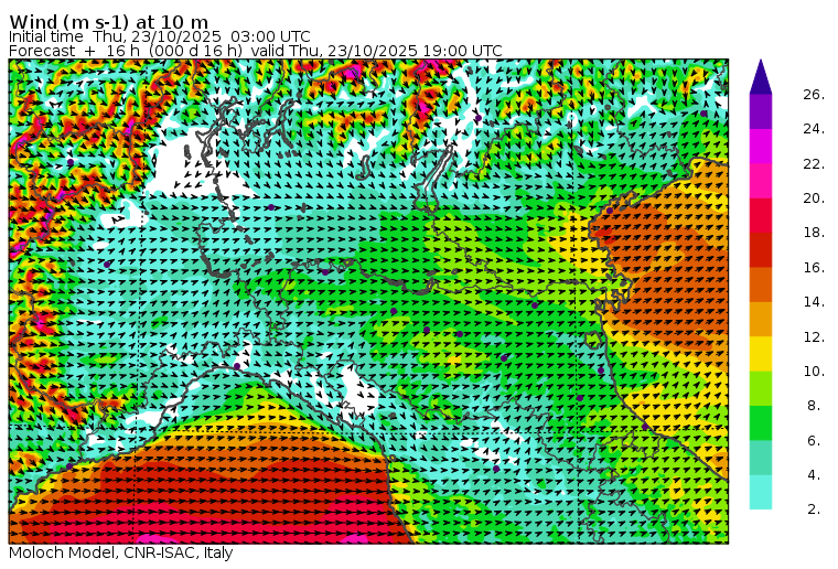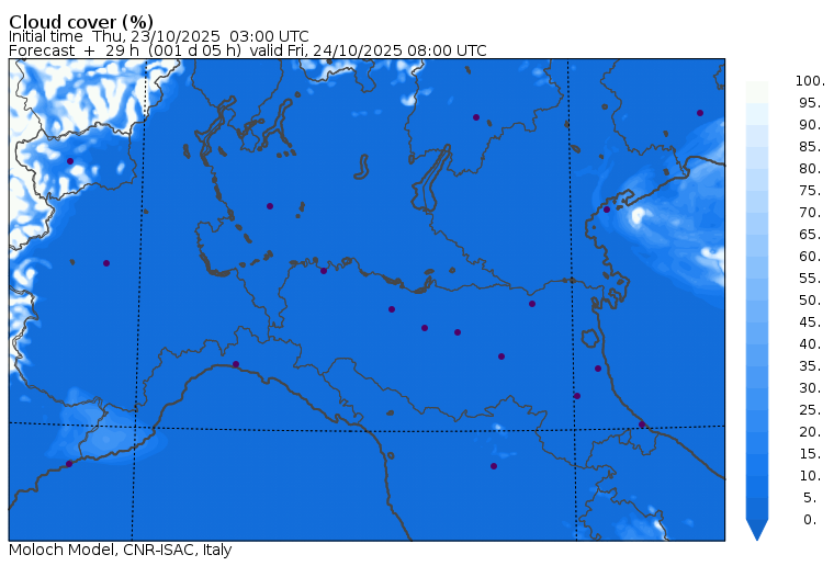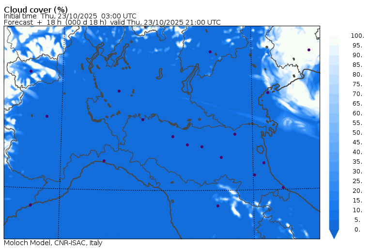 The observed data are acquired by means of a weather station IRDAM WST 7000, installed at 2 m above the lawn, west of the ISAC building. The numerical predictions with validity of two days are derived from MOLOCH model, developed by CNR-ISAC and used at the horizontal resolution of 1.25 km. The initial and boundary conditions for the predictions are obtained from analysis (00:00 UTC) and forecasts by the GFS model of NOAA-NCEP (Global Forecast System del National Centers for Environmental Prediction - National Oceanic and Atmospheric Administration, USA). More details are available at http://www.isac.cnr.it/dinamica/projects/forecasts/index.html. For the assessment of the latest monthly/seasonal/annual anomaly within the context of the last two centuries of climate variability see the link http://www.isac.cnr.it/climstor/climate_news.html. The information and graphics on this site are generated using raw data and not validated. Therefore this information is provided as-is and is not guaranteed in their accuracy and / or completeness. The conclusions derived from the contents of the site are solely of responsibility of the users who have formulated. The CNR is not liable for improper use of the information provided on this website. For info: infometeobologna @ isac.cnr.it beta version |