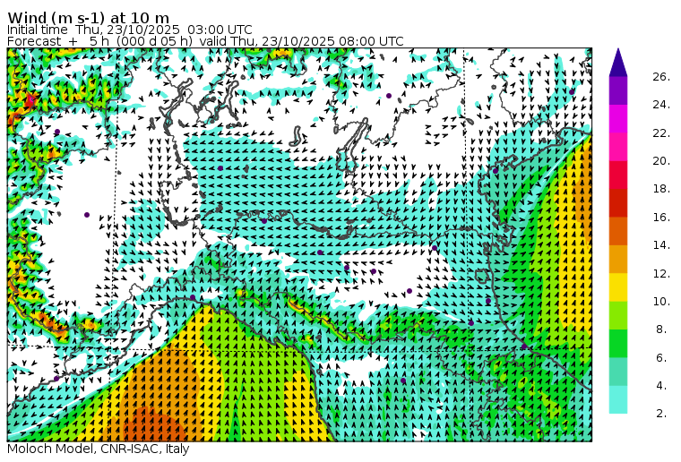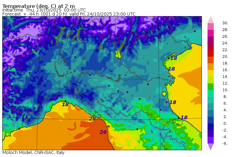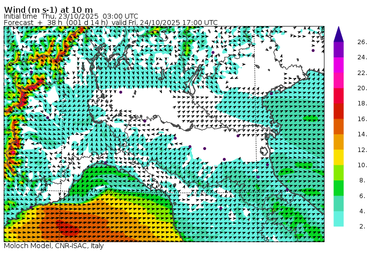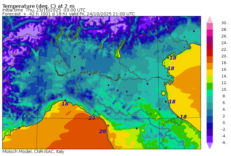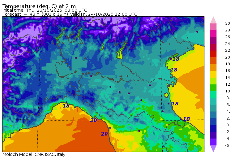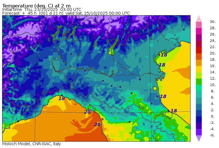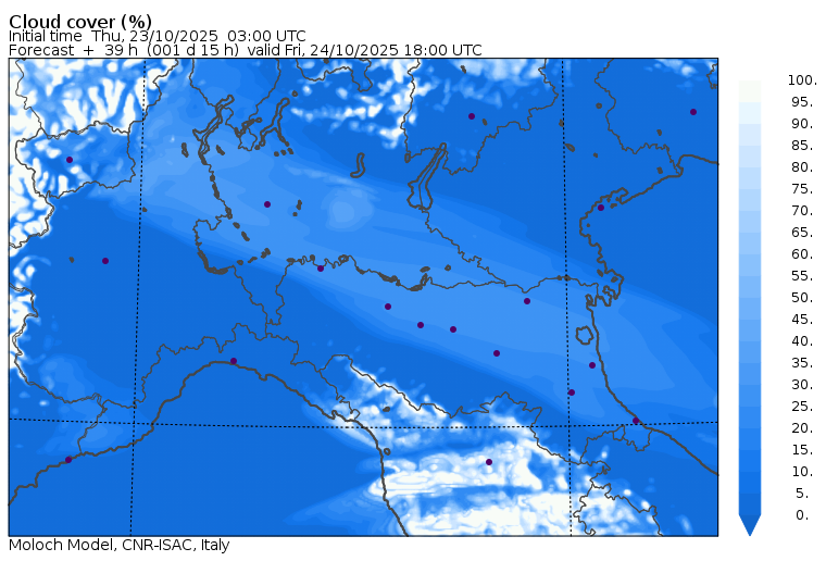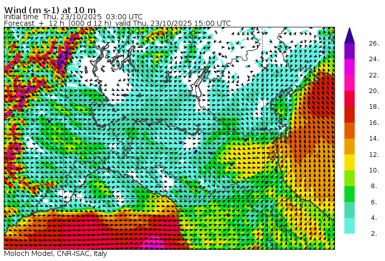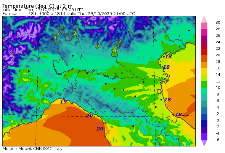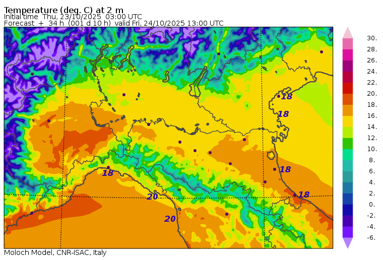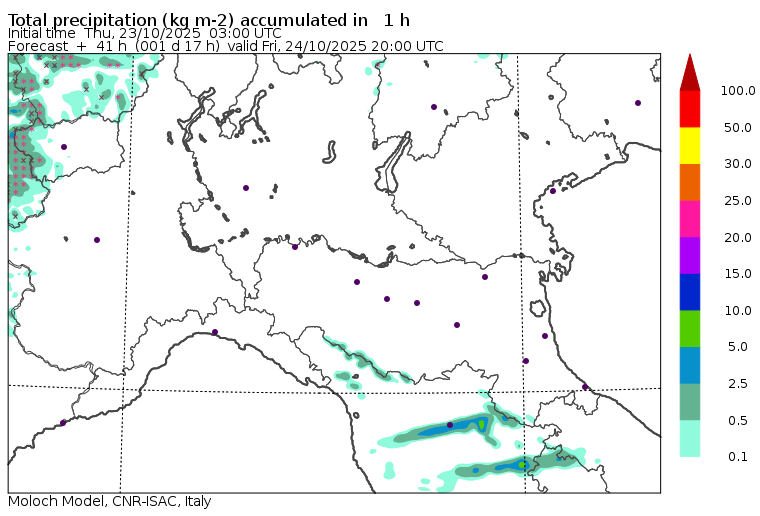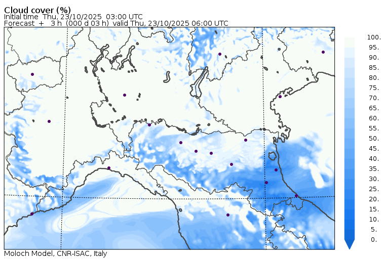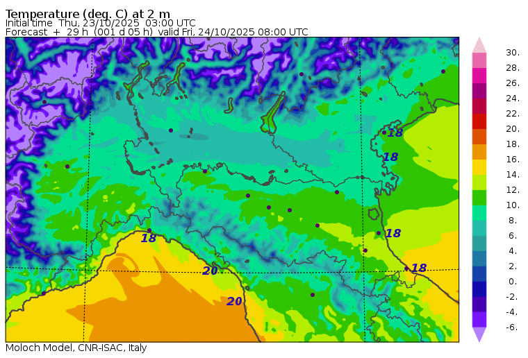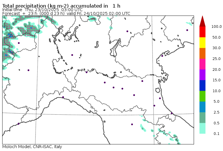 The observed data are acquired by means of a weather station IRDAM WST 7000, installed at 2 m above the lawn, west of the ISAC building. The numerical predictions with validity of two days are derived from MOLOCH model, developed by CNR-ISAC and used at the horizontal resolution of 1.25 km. The initial and boundary conditions for the predictions are obtained from analysis (00:00 UTC) and forecasts by the GFS model of NOAA-NCEP (Global Forecast System del National Centers for Environmental Prediction - National Oceanic and Atmospheric Administration, USA). More details are available at http://www.isac.cnr.it/dinamica/projects/forecasts/index.html. For the assessment of the latest monthly/seasonal/annual anomaly within the context of the last two centuries of climate variability see the link http://www.isac.cnr.it/climstor/climate_news.html. The information and graphics on this site are generated using raw data and not validated. Therefore this information is provided as-is and is not guaranteed in their accuracy and / or completeness. The conclusions derived from the contents of the site are solely of responsibility of the users who have formulated. The CNR is not liable for improper use of the information provided on this website. For info: infometeobologna @ isac.cnr.it beta version |