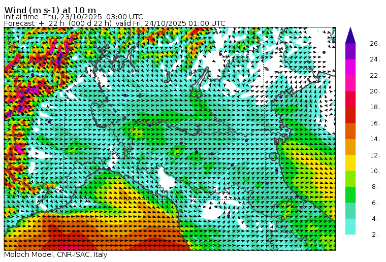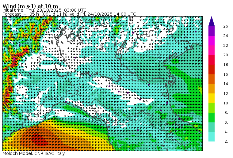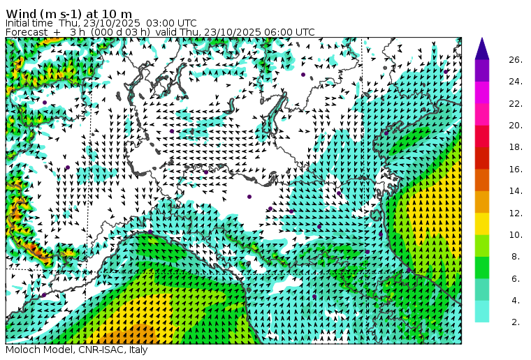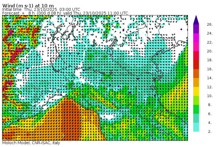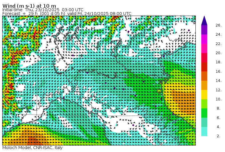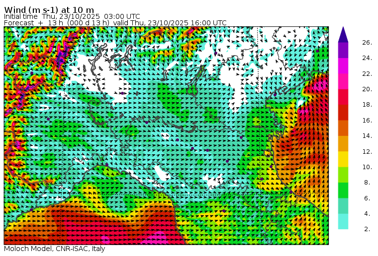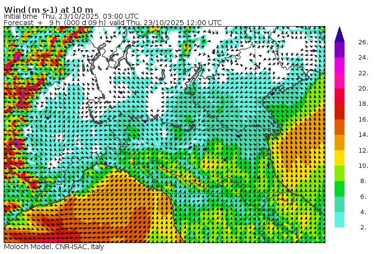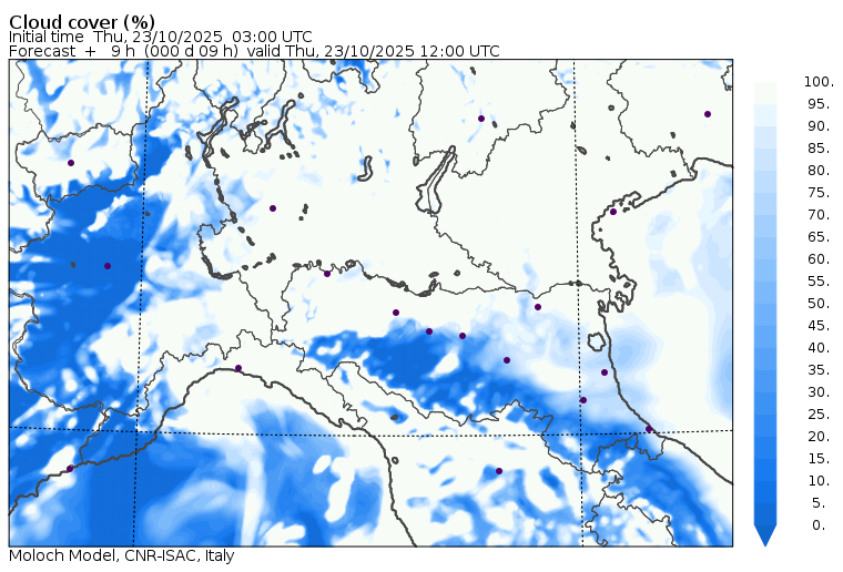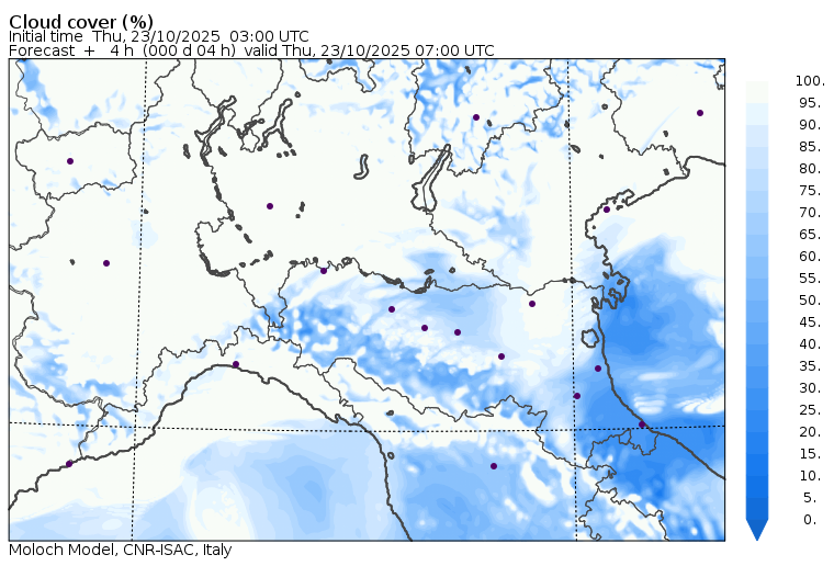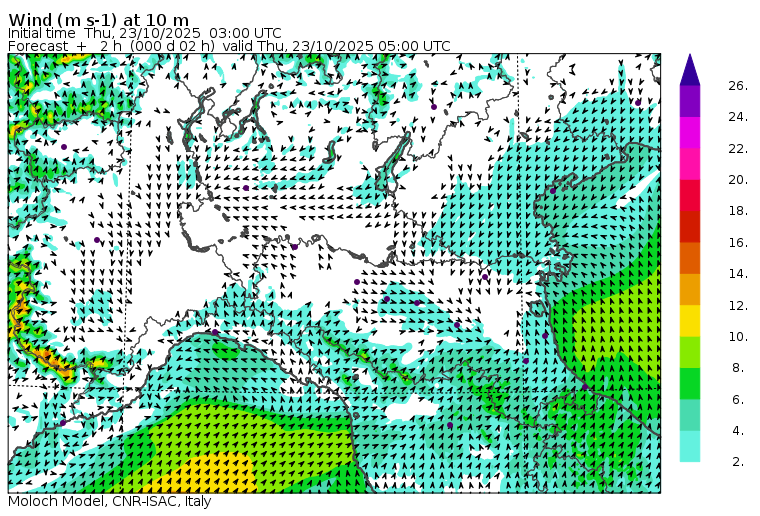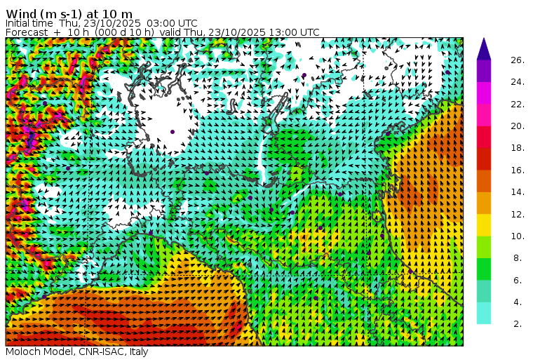 Maps of regional (hourly) and national (every three hours) forecasting for temperature, precipitation (total and snow), cloud cover and wind. For regional maps sea water temperature at some coastal locations is shown. Meteorological data observed today at the Bologna Research Area.