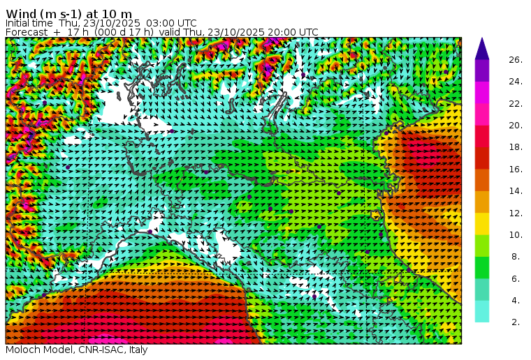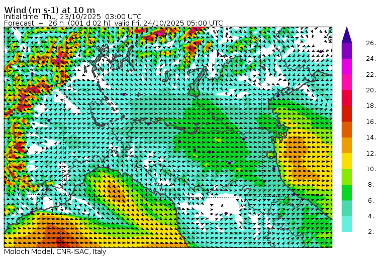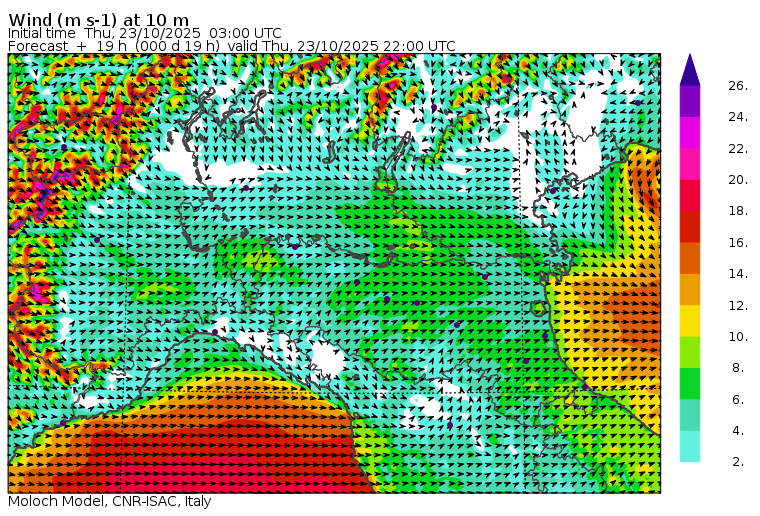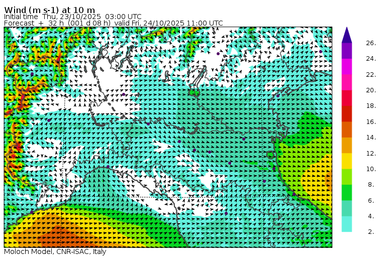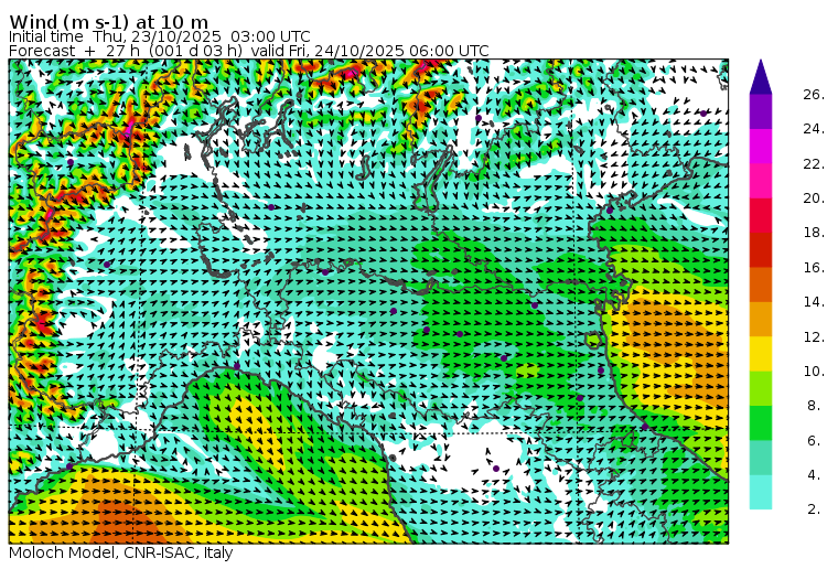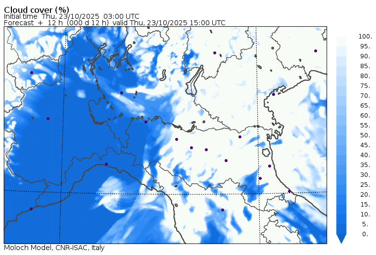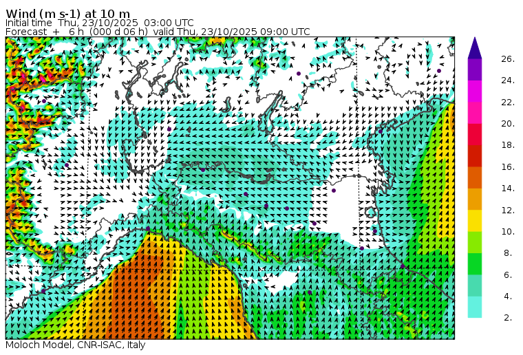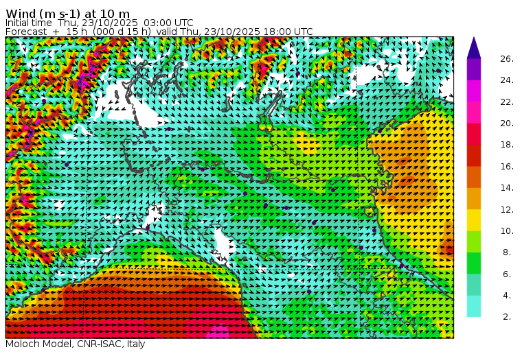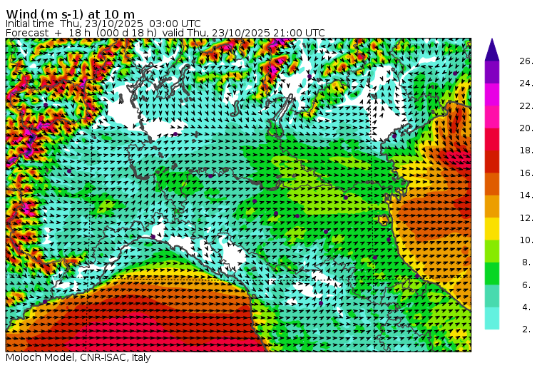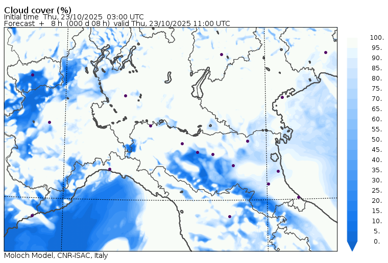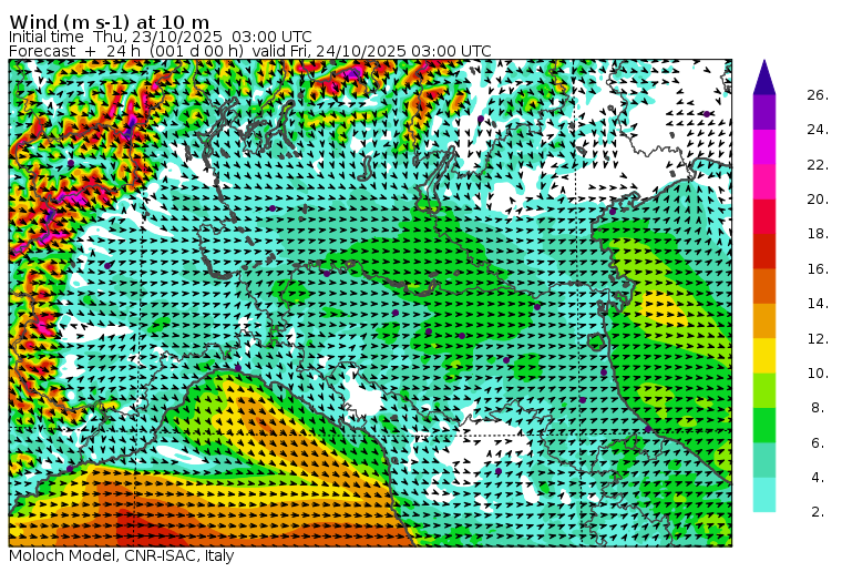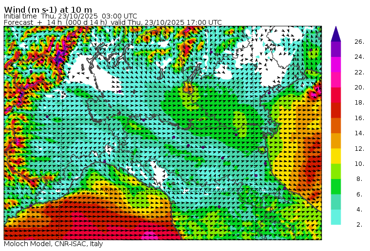 Maps of regional (hourly) and national (every three hours) forecasting for temperature, precipitation (total and snow), cloud cover and wind. For regional maps sea water temperature at some coastal locations is shown. Meteorological data observed today at the Bologna Research Area.