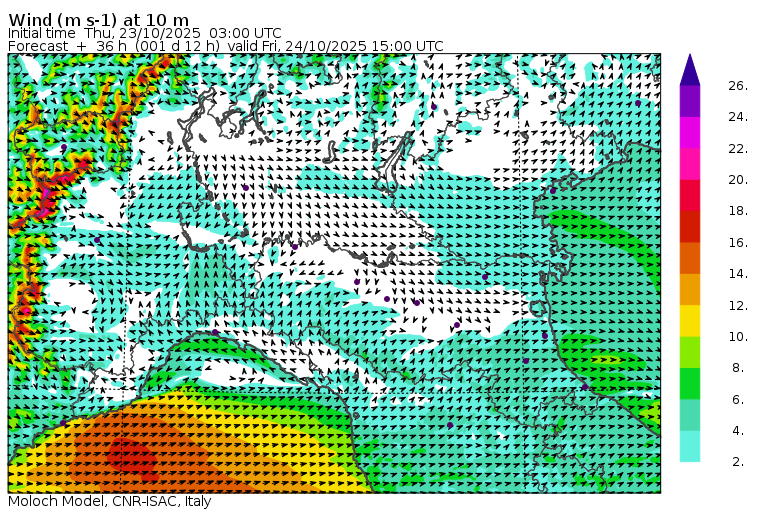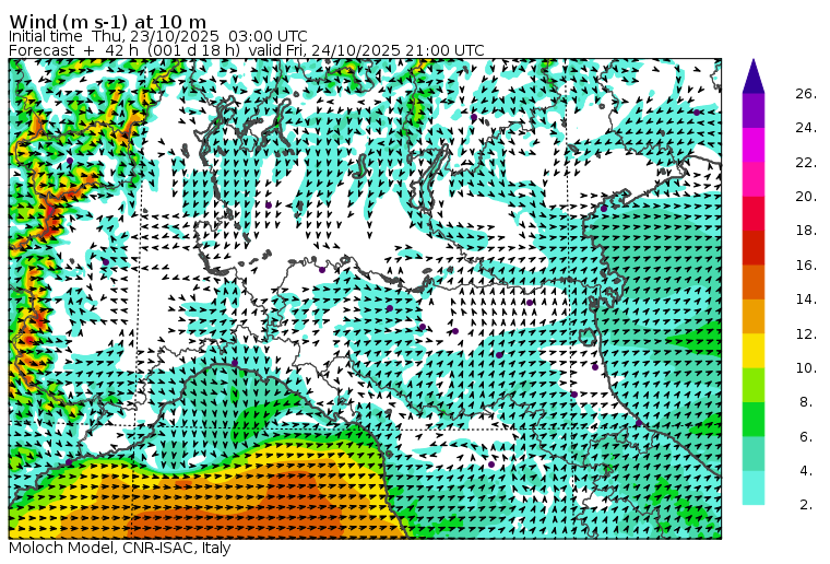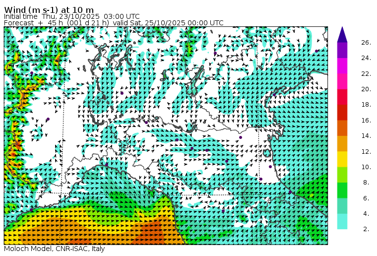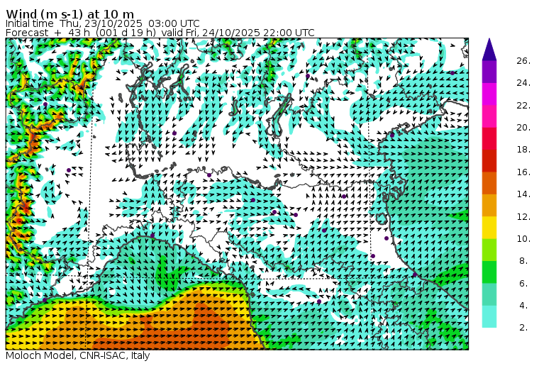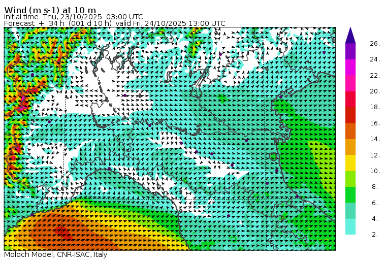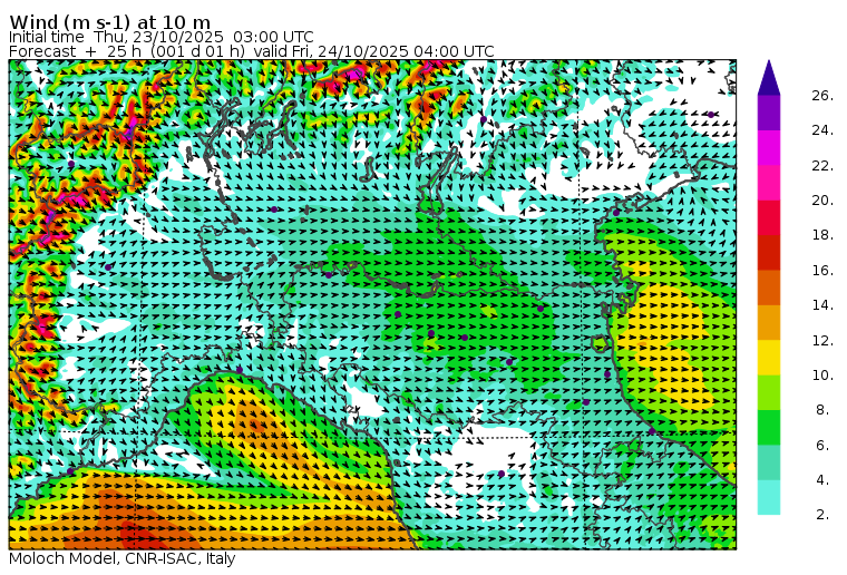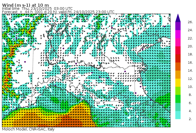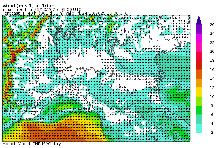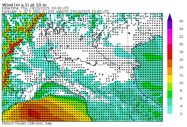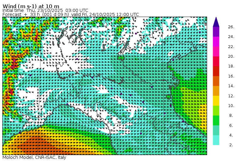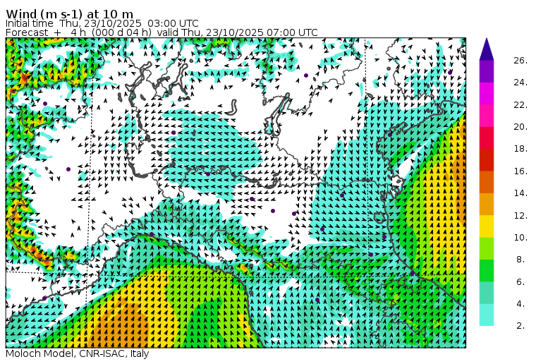 Maps of regional (hourly) and national (every three hours) forecasting for temperature, precipitation (total and snow), cloud cover and wind. For regional maps sea water temperature at some coastal locations is shown. Meteorological data observed today at the Bologna Research Area.