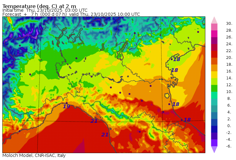 Data observed in the days of yesterday and today (dotted lines) and numerical predictions for today and tomorrow (lighter solid lines). ![]() The "prediction" for yesterday (darker solid lines) is shown for a comparison with the observed data. The averages of the observed data are performed over 10 minutes, while the numerical value of the model predictions were computed with an hourly resolution. The colored stripe is the range of temperature variation between the climate averages of the minimum and maximum (daily values for the period 1971-2000). The UV index is calculated on the basis of radiometric measurements (see risk table). |